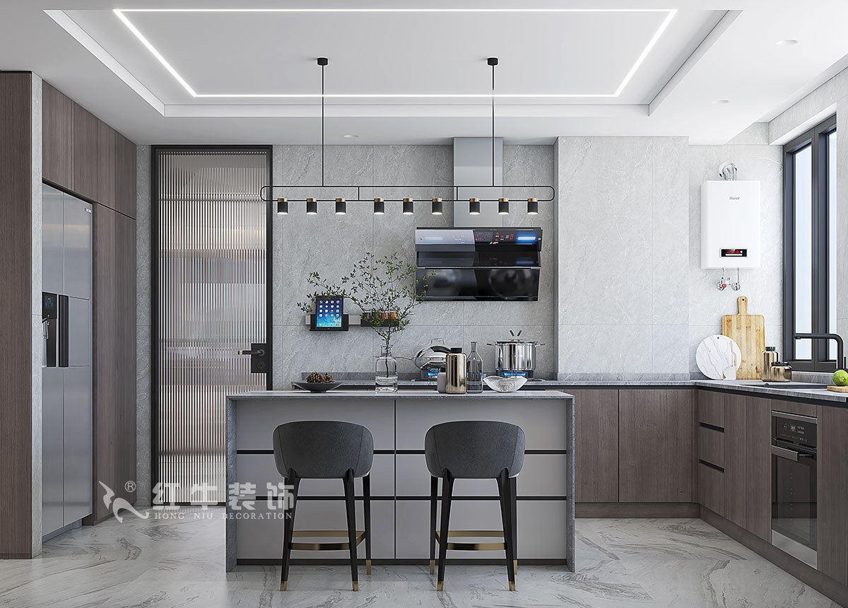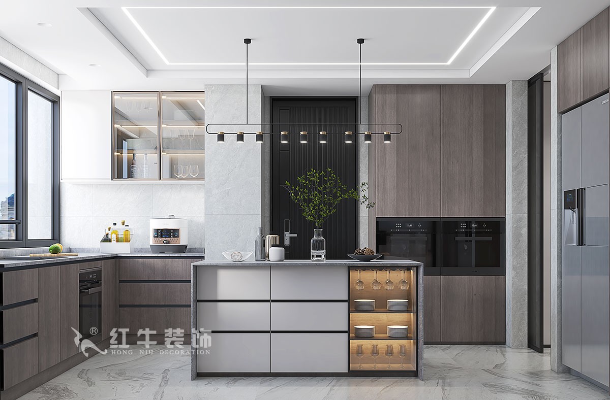 2、超大的廚房有19.2平方,廚房櫥柜設(shè)計成G字形。操作使用方便,吧臺的設(shè)計增加了家人之間的互動,同時也可以再餐廳完成簡餐。