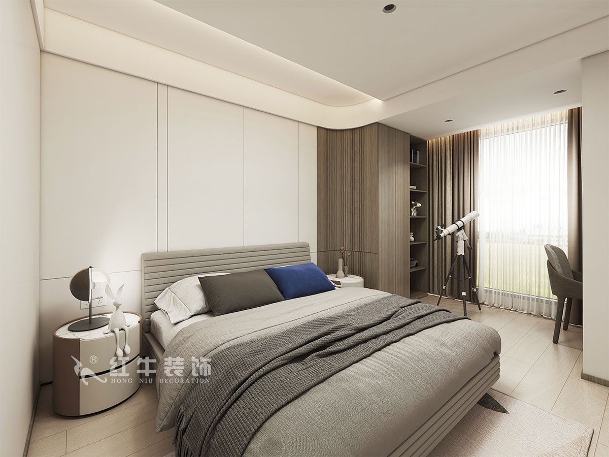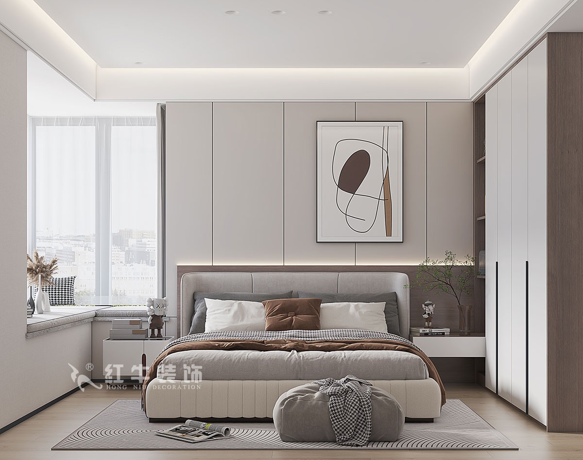 4、整體風(fēng)格現(xiàn)代輕奢,餐廳墻面的裝飾面板窗簾槽,和酒柜顏色統(tǒng)一,懸浮吊頂?shù)脑O(shè)計,淺灰色的石材地面,墻深地淺的設(shè)計,讓整個空間看上去沉穩(wěn)中不失時尚??蛷d電視背景墻整體石材+裝飾面板護(hù)墻,電視機(jī)柜采用石材地臺形式,板簡潔沉穩(wěn)過道墻面和電視背景墻形成整體,石材和裝飾面板搭配,另外一面是兩個儲藏室的門,均采用“電動巴士”門的設(shè)計,因為過道比較長,墻面上的兩個壁龕和內(nèi)嵌裝飾畫,完美的解決了這個問題。主臥室L形的飄窗,搭配灰色的飄窗軟墊,讓整個空間更有柔性的美,臥室的背景墻也和柜子形成了一體,床頭柜直接從柜子中延伸出,上方開放式個隔層,方便房屋主人擺放一些書籍和裝飾品。
