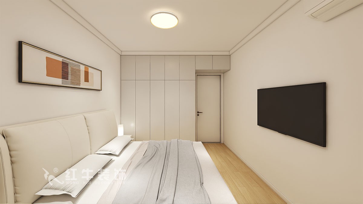 臥室單眼皮吊頂設(shè)計使空間更加不壓抑,白灰色色色大床更適合兩人的居住需求和觀感,和奶茶色的柜子相得益渣。整個空間色調(diào)溫和的,很適合臥室的氛圍感。