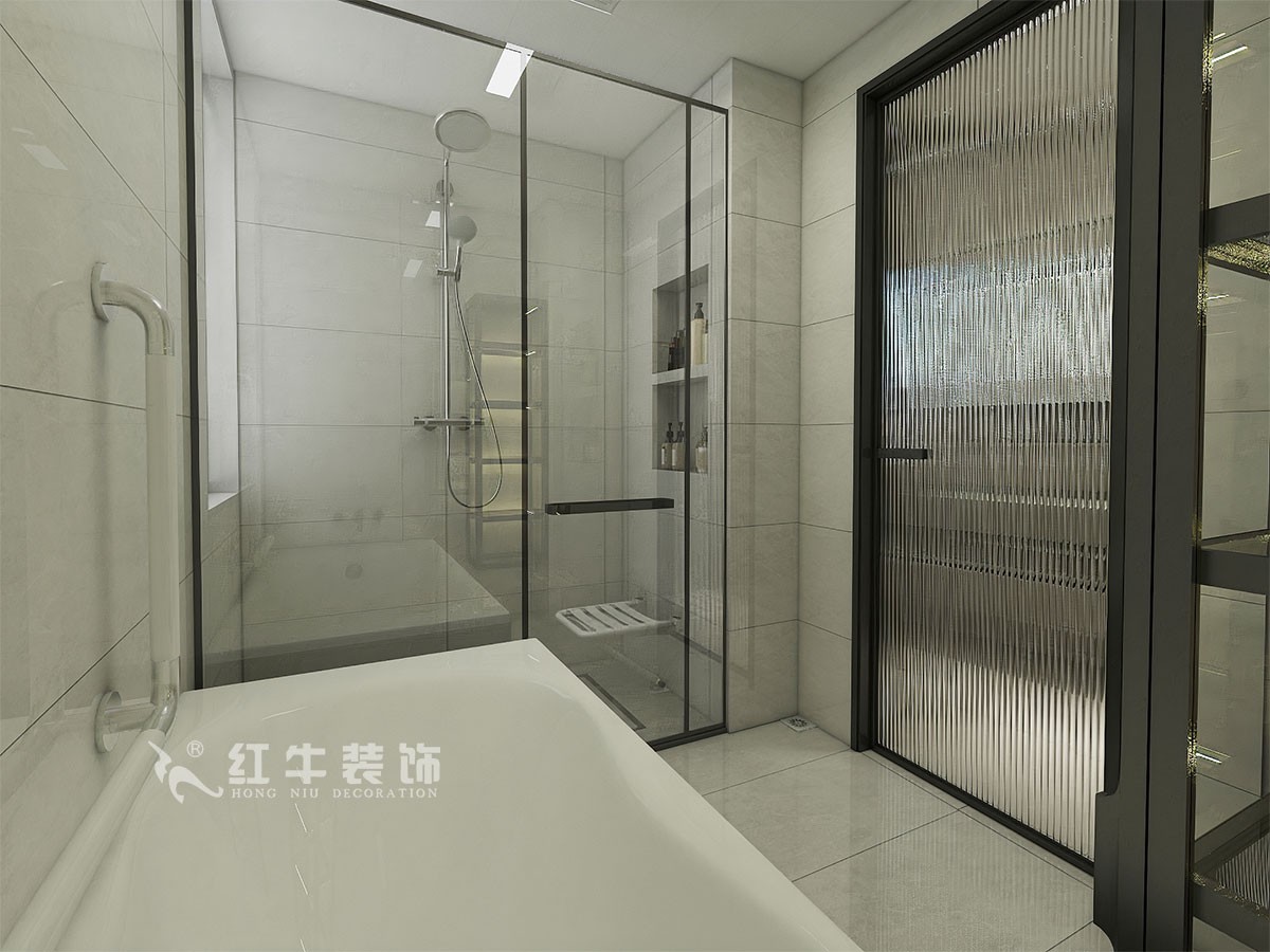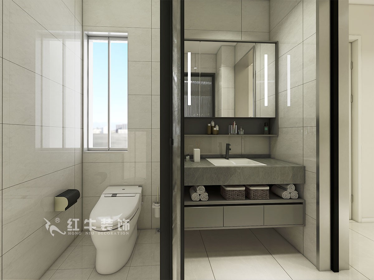 2、衛(wèi)生間的設(shè)計(jì)是把兩個(gè)衛(wèi)生間的部分面積合并了一個(gè)三分區(qū)的衛(wèi)生間,而且再干區(qū)的位置做了一個(gè)口袋門的隱形門設(shè)計(jì),這樣的衛(wèi)生間又是一個(gè)整體。