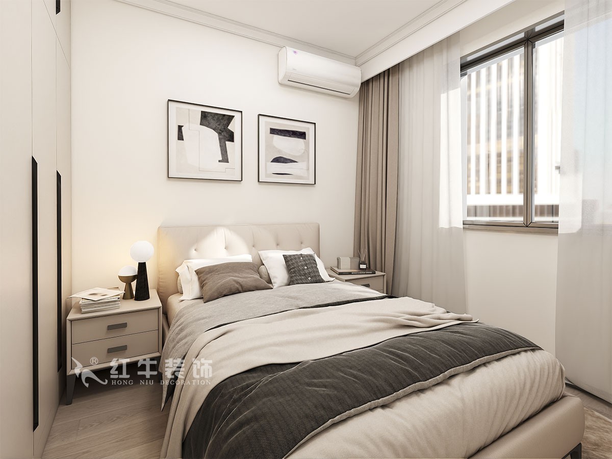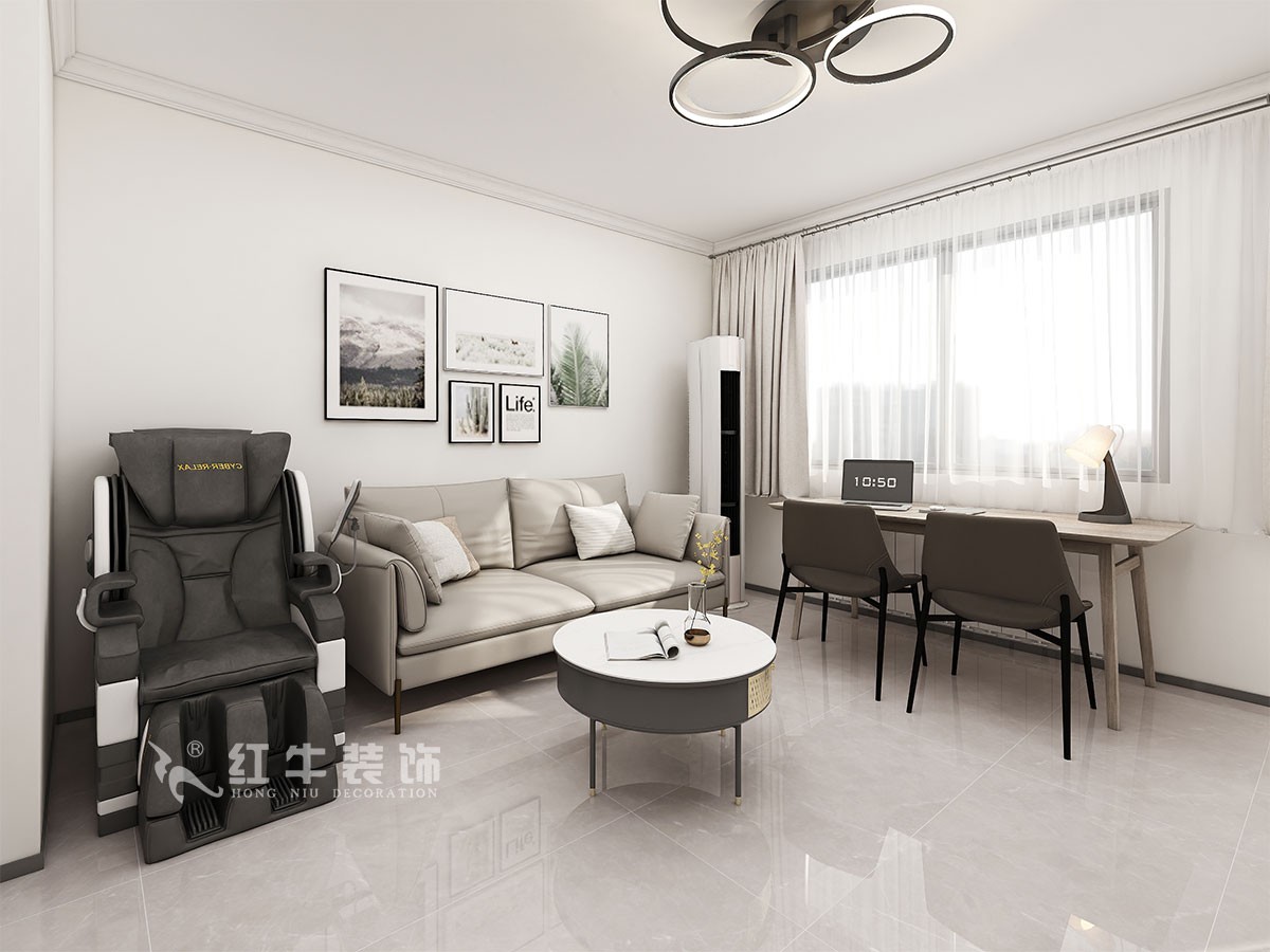 風格定義為現代簡約。色彩以白色、暖灰色作為主色,木色作為點綴,時尚但不缺乏溫馨,局部跳色增加層次,家具選擇上也冷暖搭配,比較經典。