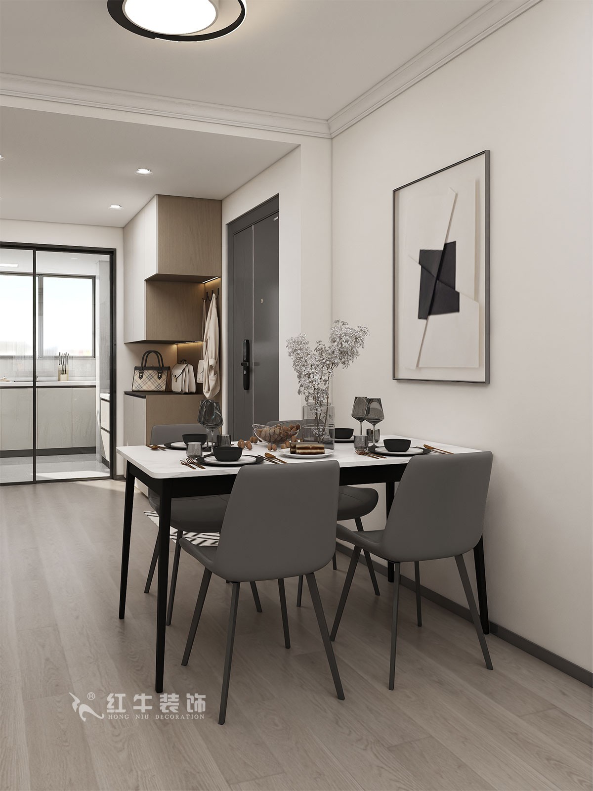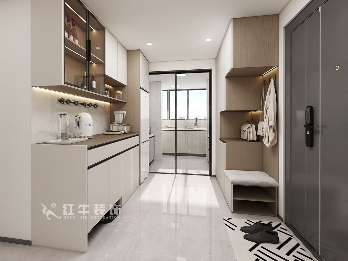 房子規(guī)整,沒有太多需要調整的結構。衛(wèi)生間的門方向的調整,增加了衛(wèi)生間功能的利用率。進門餐邊柜,鞋柜,功能齊全。