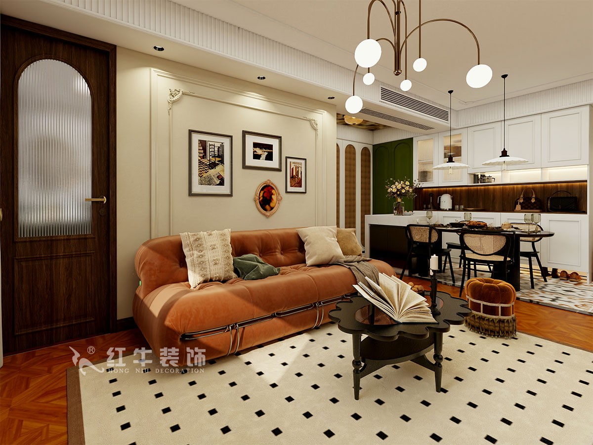 此案主要是三口居家居住,整體以法式南洋復(fù)古風(fēng)格為主,胡桃木的地板+藤編餐椅,復(fù)古風(fēng)滿滿。兩側(cè)墨綠色和白色餐邊柜,有藏有露,收納能力Max,關(guān)鍵是顏值還高。拼木地板,法式氛圍感的標(biāo)配。