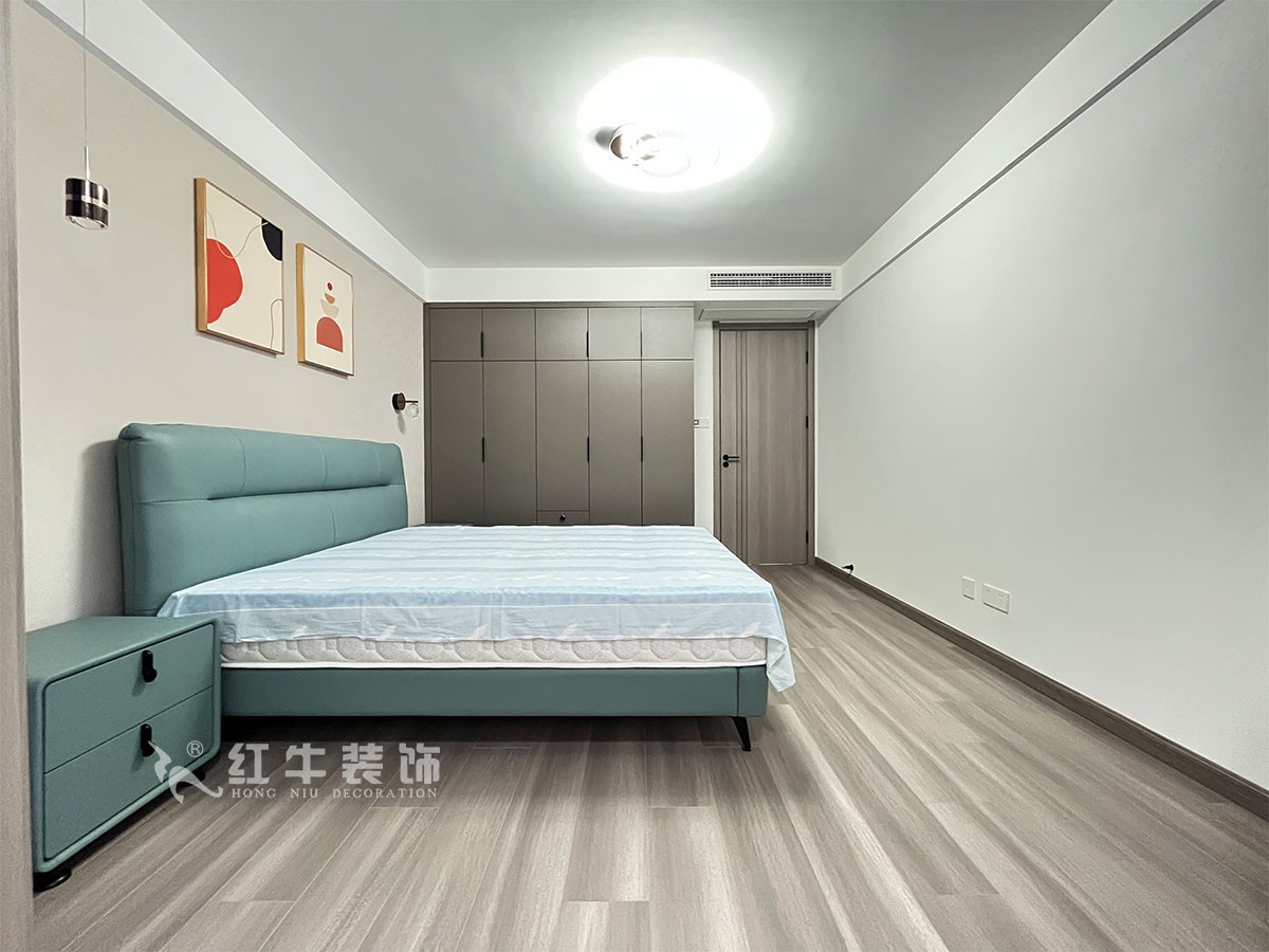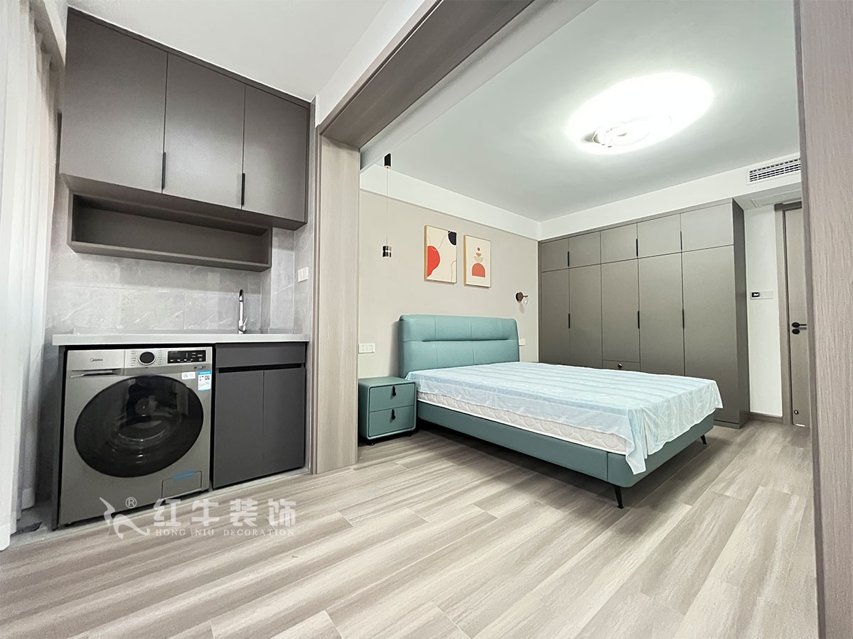 此案主要是養(yǎng)老居住,在舒適度上要求比較高,臥室是整套房子中最私人也是最體現(xiàn)出溫馨休閑感的空間,在設(shè)計時體現(xiàn)出靜謐舒適的感覺,并且與其他空間明顯的區(qū)別,利用書房厚度開洞口,把電視掛墻上,把冰箱嵌入,更好的布局。這樣舒適度更好,區(qū)域劃分明顯,動靜分離。吊頂簡潔大氣,配以輕現(xiàn)代家具,完美闡釋了簡約風格。整體現(xiàn)代簡約風格的設(shè)計,搭配上顯眼的綠色植物讓整個空間呈現(xiàn)出一種生機勃勃的自然美。