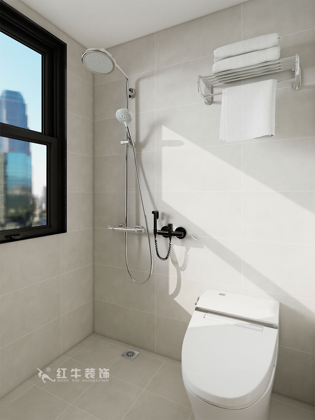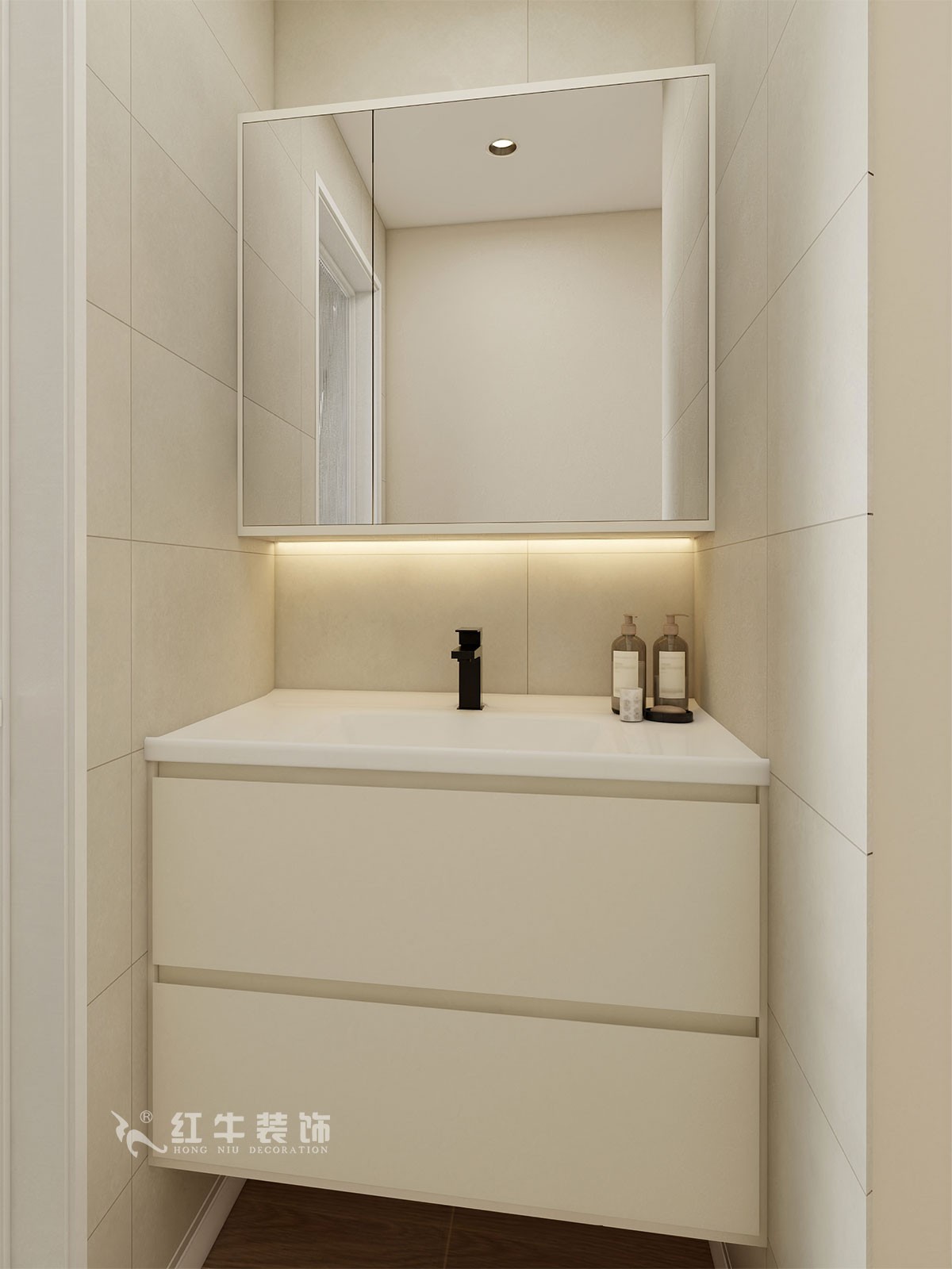 衛(wèi)生間說明:干區(qū)選擇整體色彩搭配干凈、大方,墻面設(shè)計選擇大尺寸瓷磚上墻,高級感滿滿。