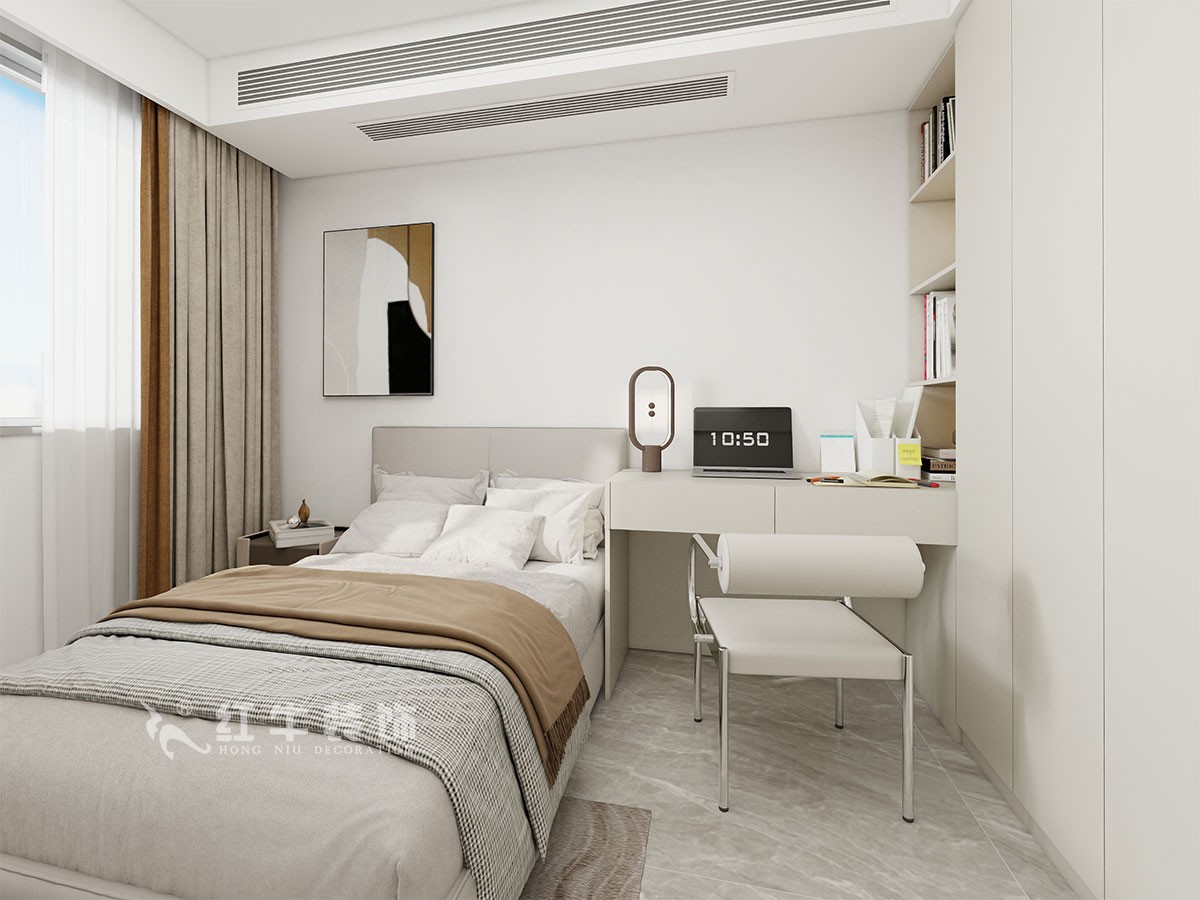房型基本規(guī)整,廚房面積偏小,需要解決冰箱的擺放問題。過道狹長,方案擴大了廚房的空間,衛(wèi)生間做了干濕分離,使得北臥和書房面積擴大,次臥也重新做了功能分區(qū),使得整體空間規(guī)劃更合理。