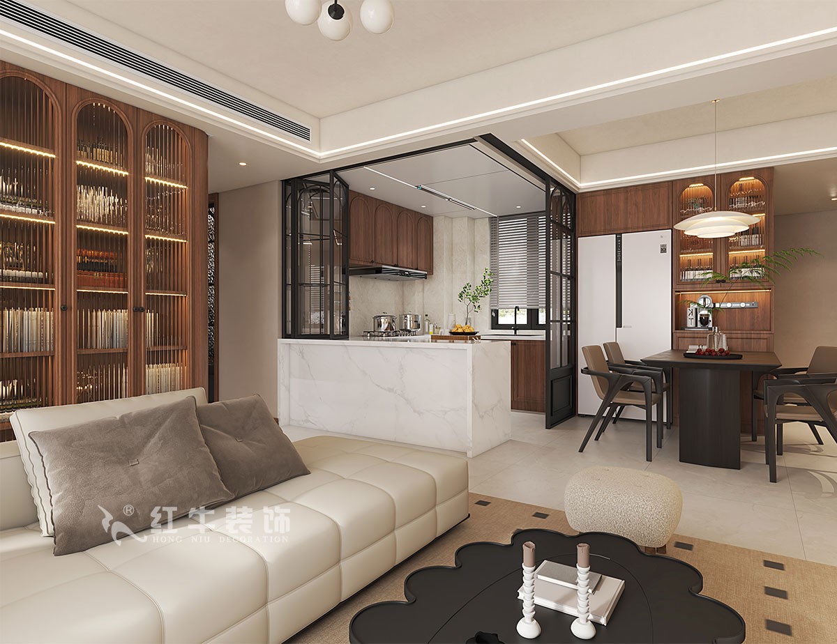 本案設(shè)計(jì)墻面用的是米白色乳膠漆,家具柜體以白色為主,配上木色柜體調(diào)色,讓空間更加溫馨。盡量少吊頂,吊頂層高做高點(diǎn),燈光設(shè)計(jì)講究空間的柔和,著重點(diǎn)光源的點(diǎn)綴,讓家更加明亮溫馨。