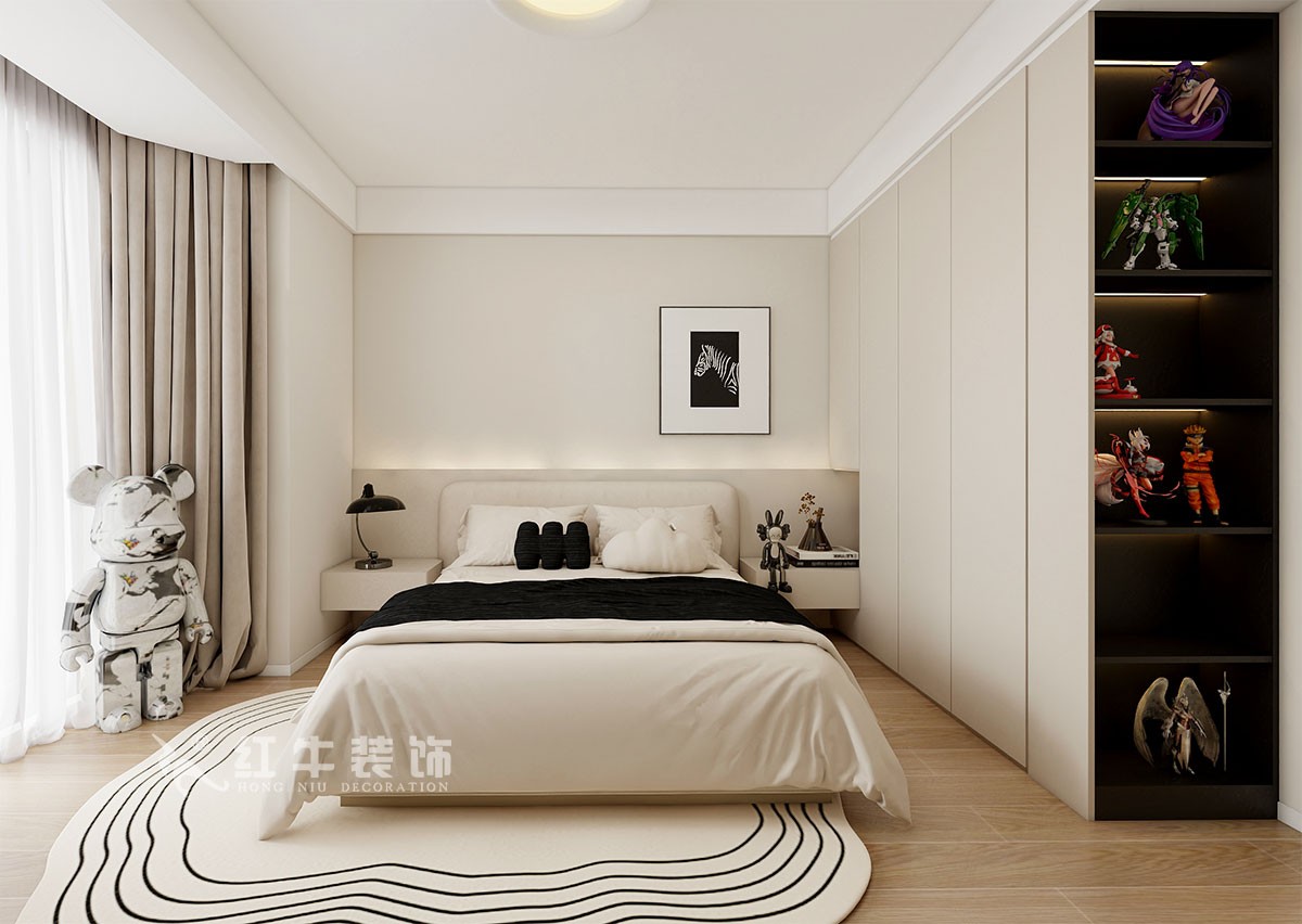 臥室說明:搭配大面積的咖色定制衣柜,床頭的光源以多種形勢呈現(xiàn),滿足不同燈光需求,又恰到好處地起到了裝飾效果,使整體臥室空間呈現(xiàn)柔亮、溫柔的舒適狀態(tài)。
