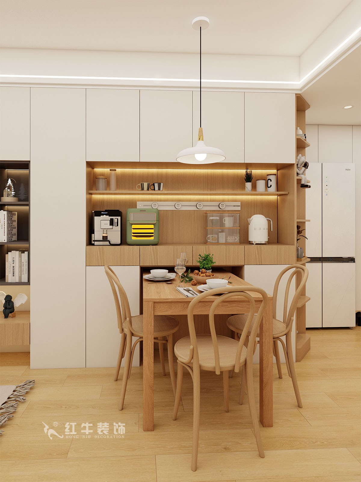 餐廳說明:餐邊柜擴(kuò)充了廚房儲物的不足,也提升了適合家庭的生活質(zhì)量。