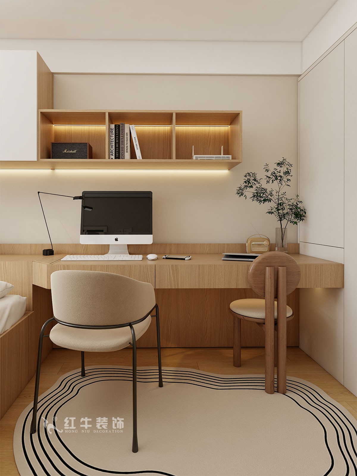 臥室說明:搭配大面積的白色定制衣柜,床頭的光源以不同形勢呈現(xiàn),既滿足不同燈光需求,又恰到好處地起到了裝飾效果,使整體臥室空間呈現(xiàn)明亮、溫柔的舒適狀態(tài)。