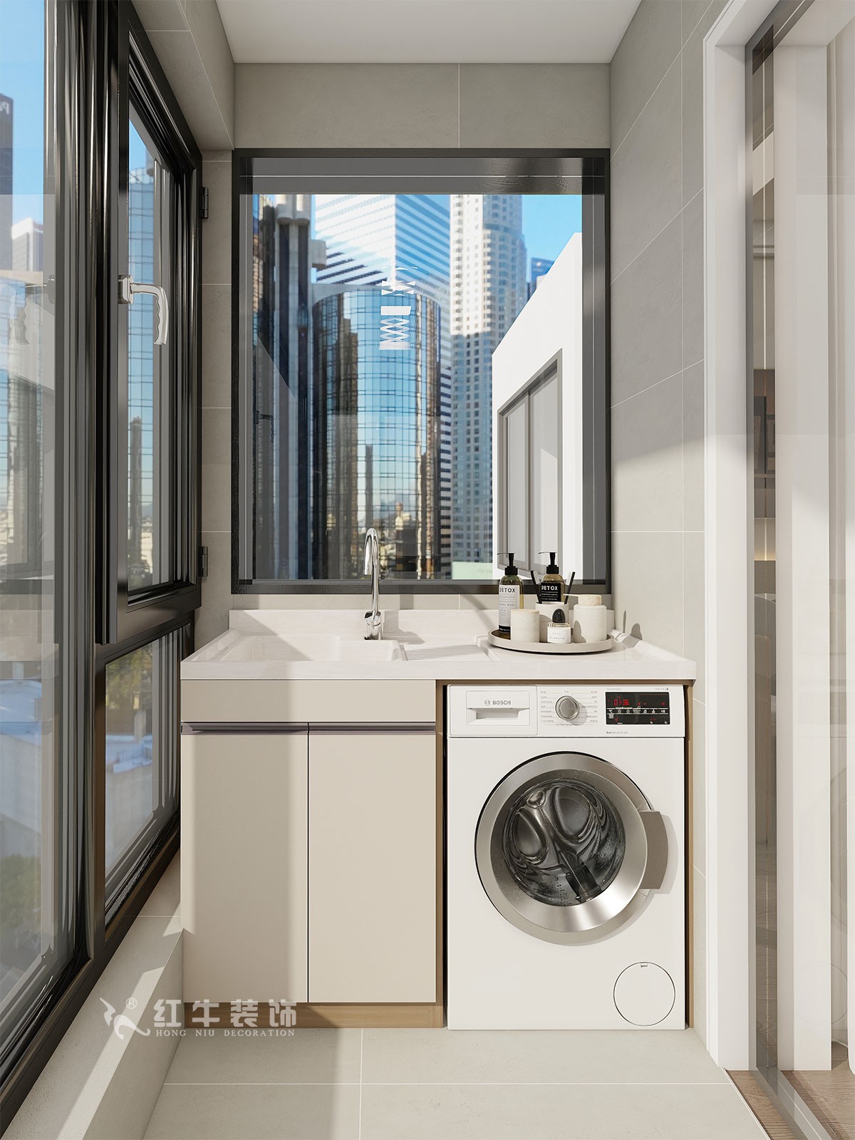 奶灰色是客戶非常追求的色彩,加上地板的質(zhì)感,相得益彰。