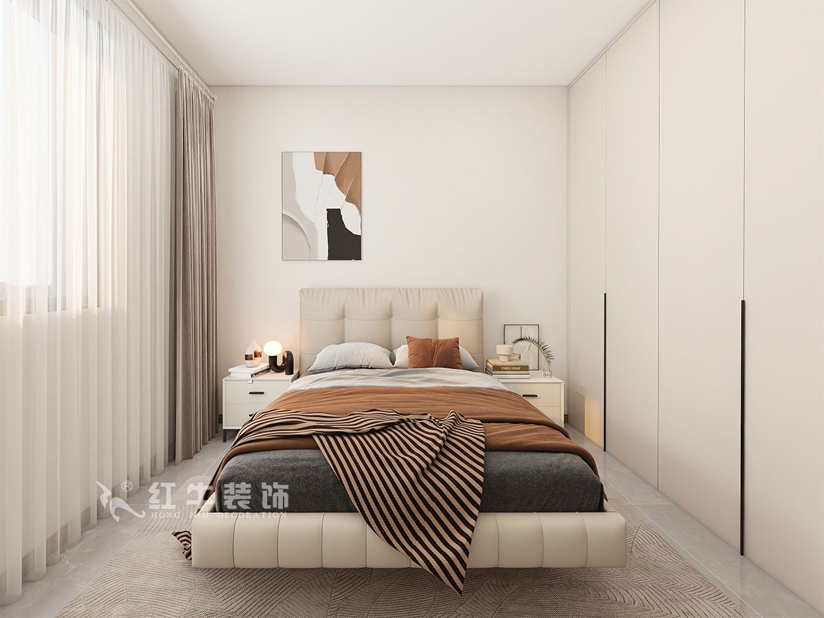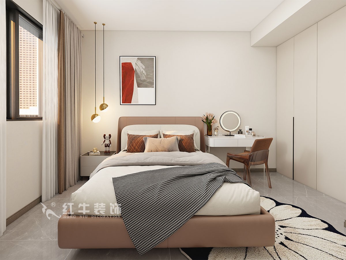此案主要是改善裝修,在舒適度上要求比較高,臥室是整套房子中最私人也是最體現(xiàn)出溫馨休閑感的空間,在設(shè)計時體現(xiàn)出靜謐舒適的感覺,并且與其他空間有明顯的區(qū)別。