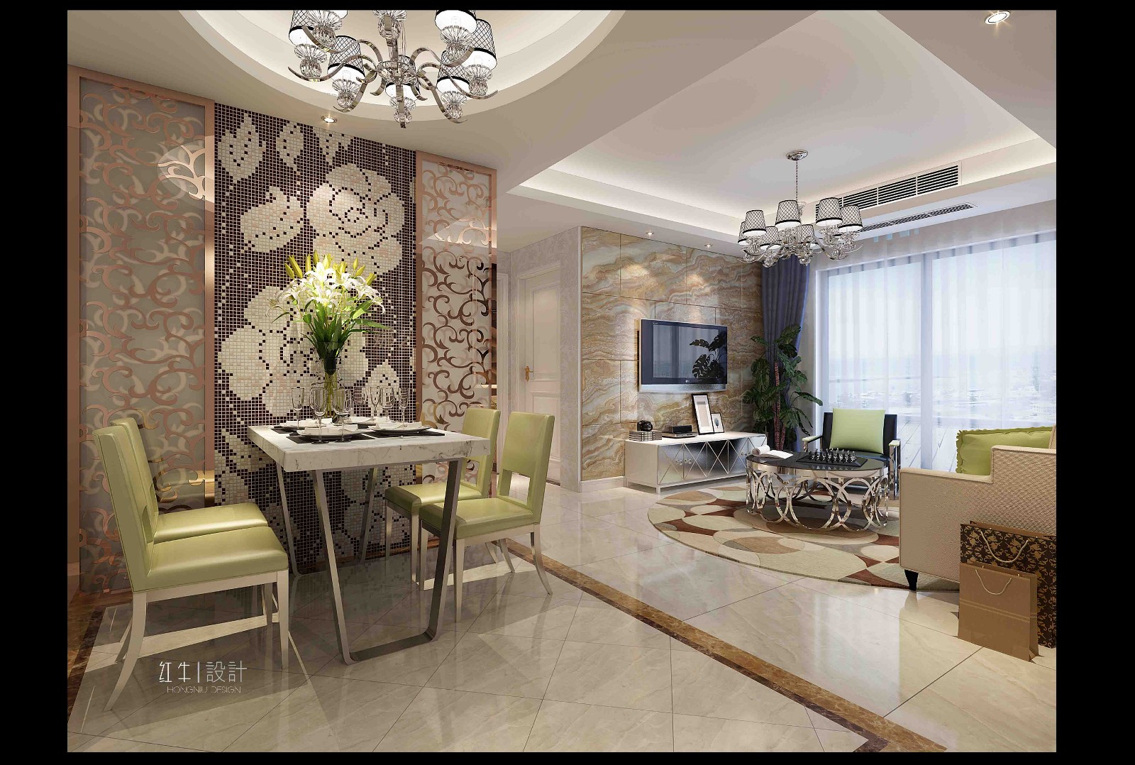 此案為婚房,要求簡潔,大氣,奢華。設(shè)計師通過墻體的改造,把儲藏室和北陽臺改造成小臥室,既增加實用性,又節(jié)省了空間。因戶型不大。所以設(shè)計師通過質(zhì)感比較強的釉面瓷磚,配以陶瓷馬賽克,地面深淺搭配的造型,和凹凸有質(zhì)的藝術(shù)造型吊頂相搭配,既延伸了空間,又提高了檔次。