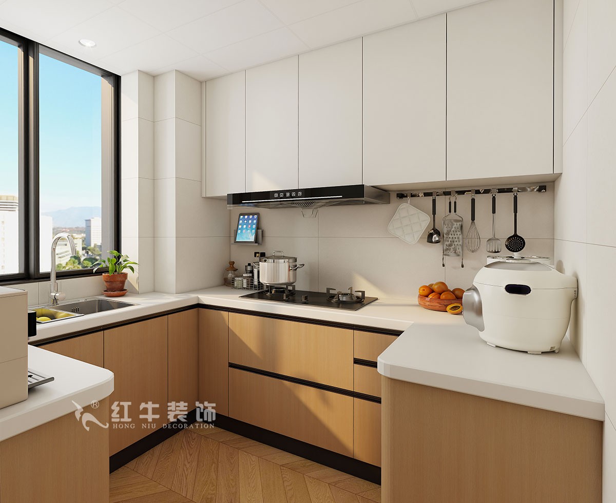 房子戶型簡單,最主要的是考慮冰箱的擺放,通過過道的利用,把冰箱內(nèi)嵌了墻體,空間更整潔。