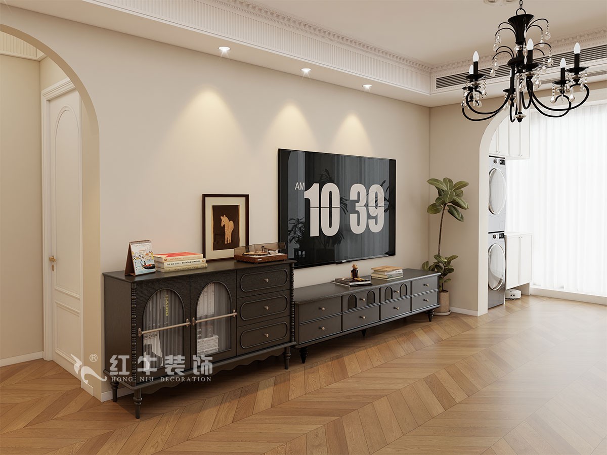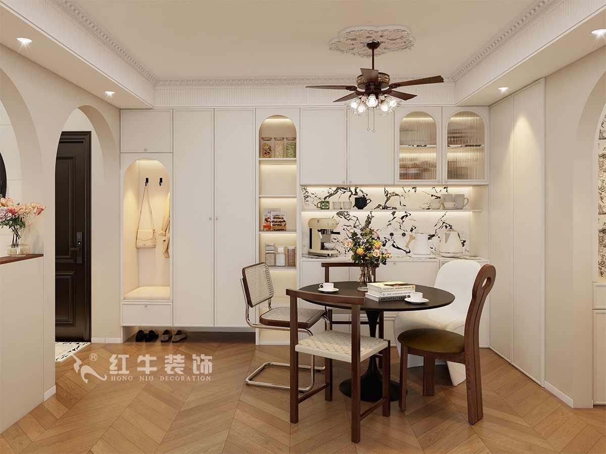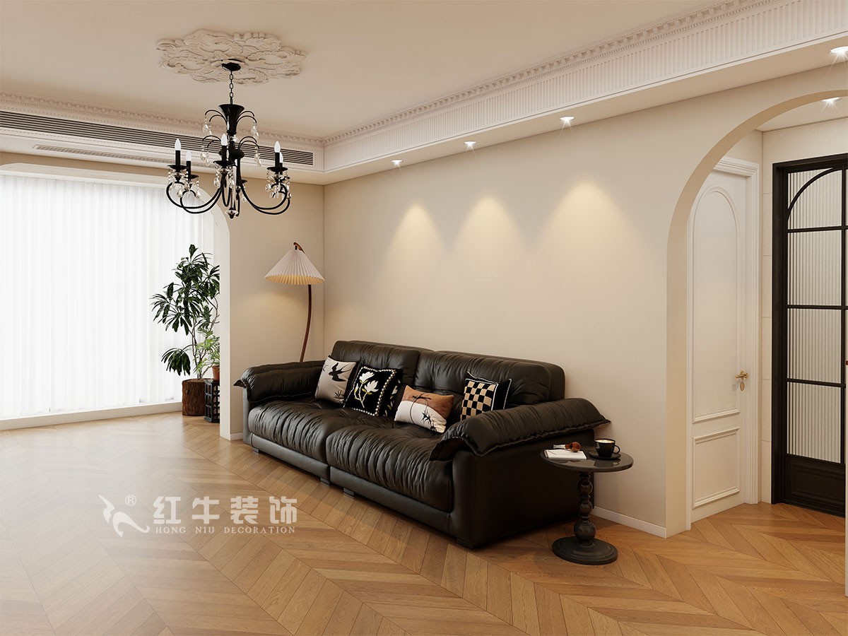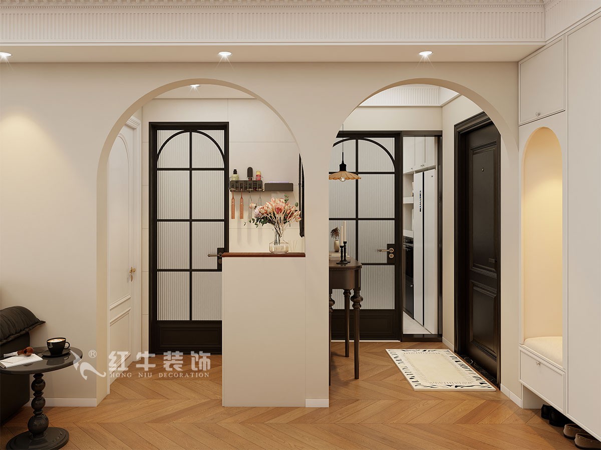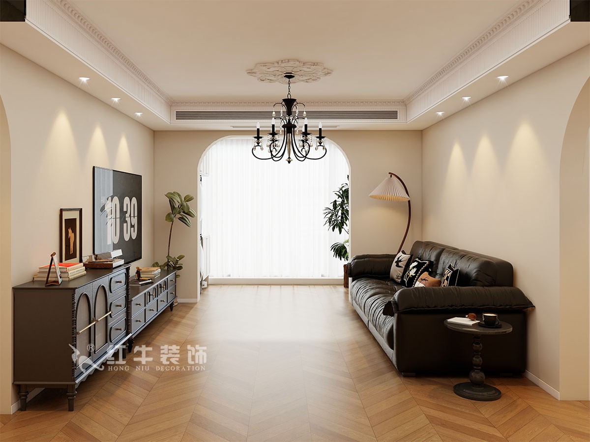 小兩口居住,女業(yè)主對裝修希望比較時尚大氣,希望未來的房子實用、大氣,最終確定了法式復古風,而本案在設計時其特色是將設計的元素、色彩、照明、原材料簡化到最少程度。但是對材料的舒適度要求很高。因此,考慮全屋通鋪木紋地板磚,配合拱形門,以極少的元素去表達空間的氛圍感。
