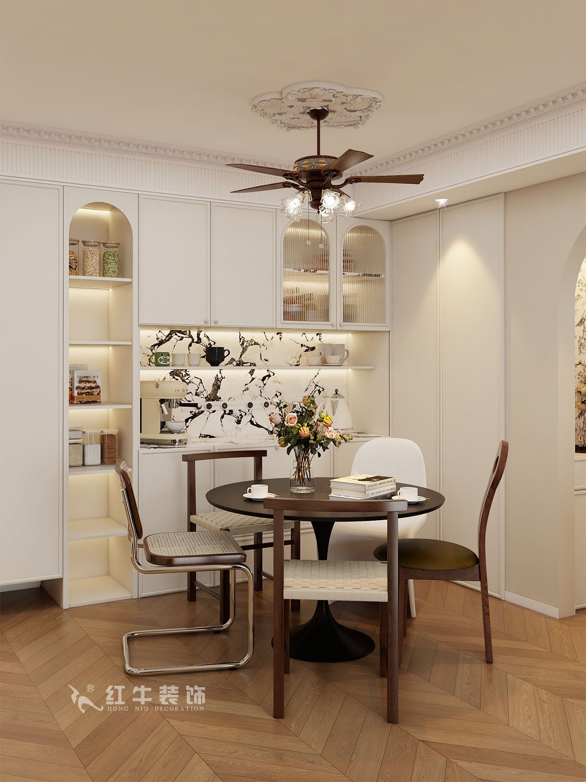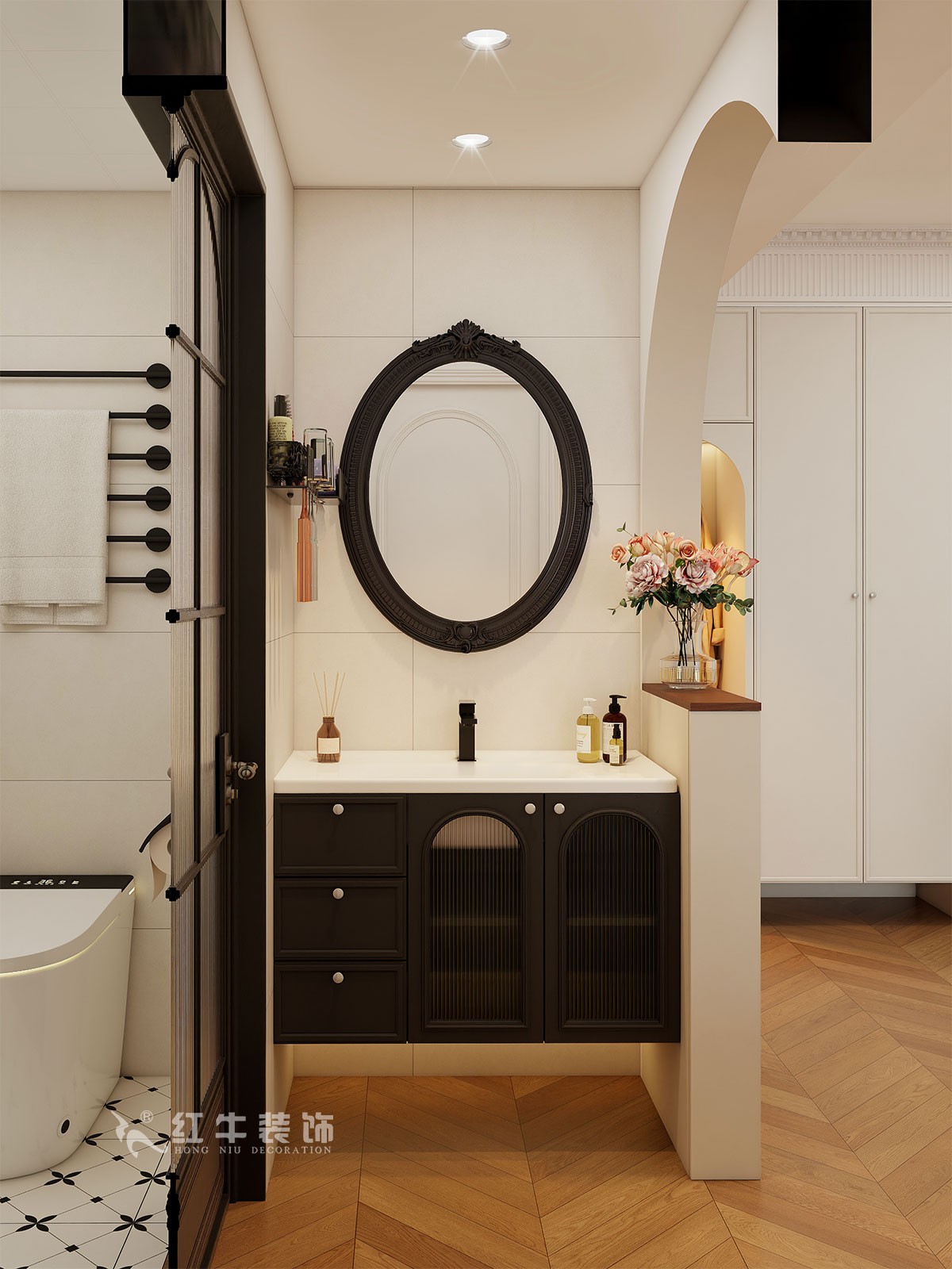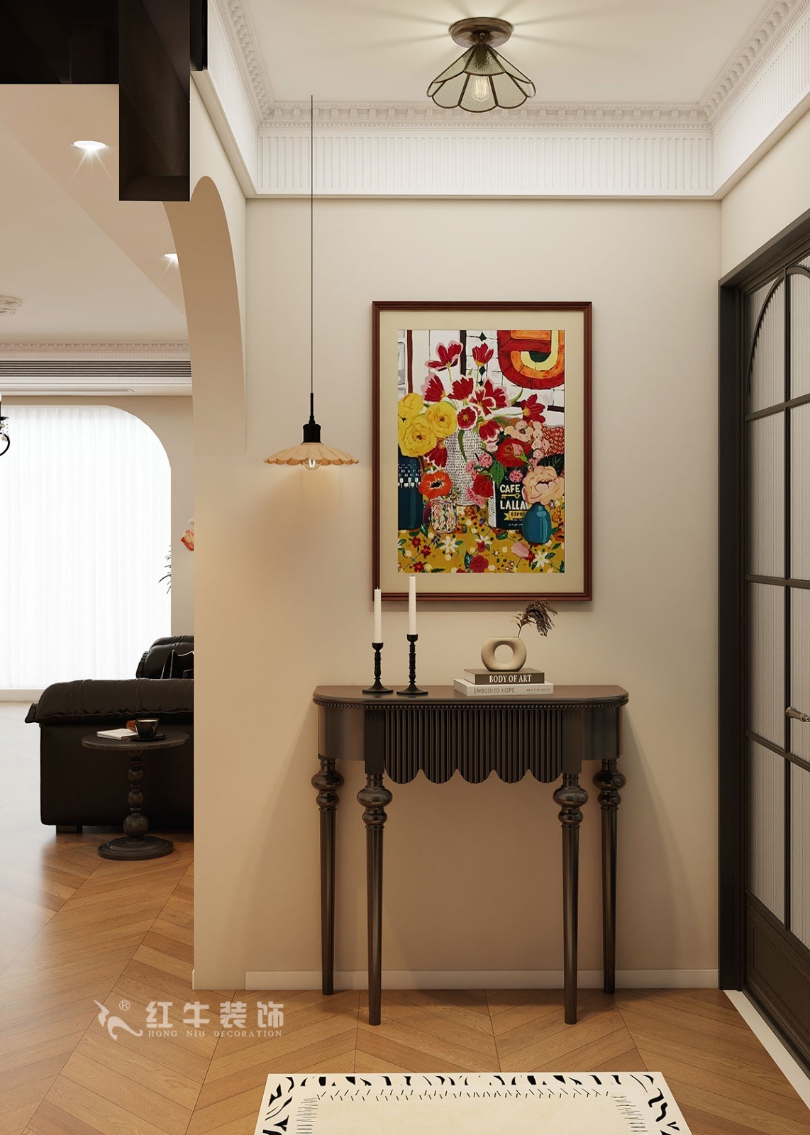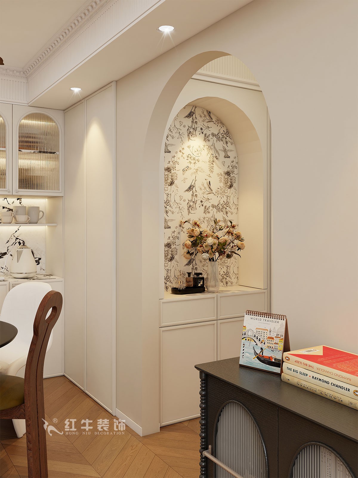 小兩口居住,女業(yè)主對裝修希望比較時尚大氣,希望未來的房子實用、大氣,最終確定了法式復古風,而本案在設計時其特色是將設計的元素、色彩、照明、原材料簡化到最少程度。但是對材料的舒適度要求很高。因此,考慮全屋通鋪木紋地板磚,配合拱形門,以極少的元素去表達空間的氛圍感。