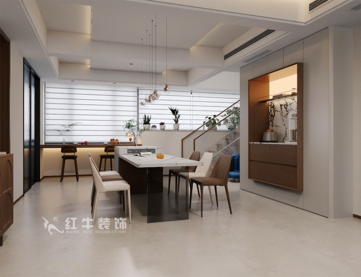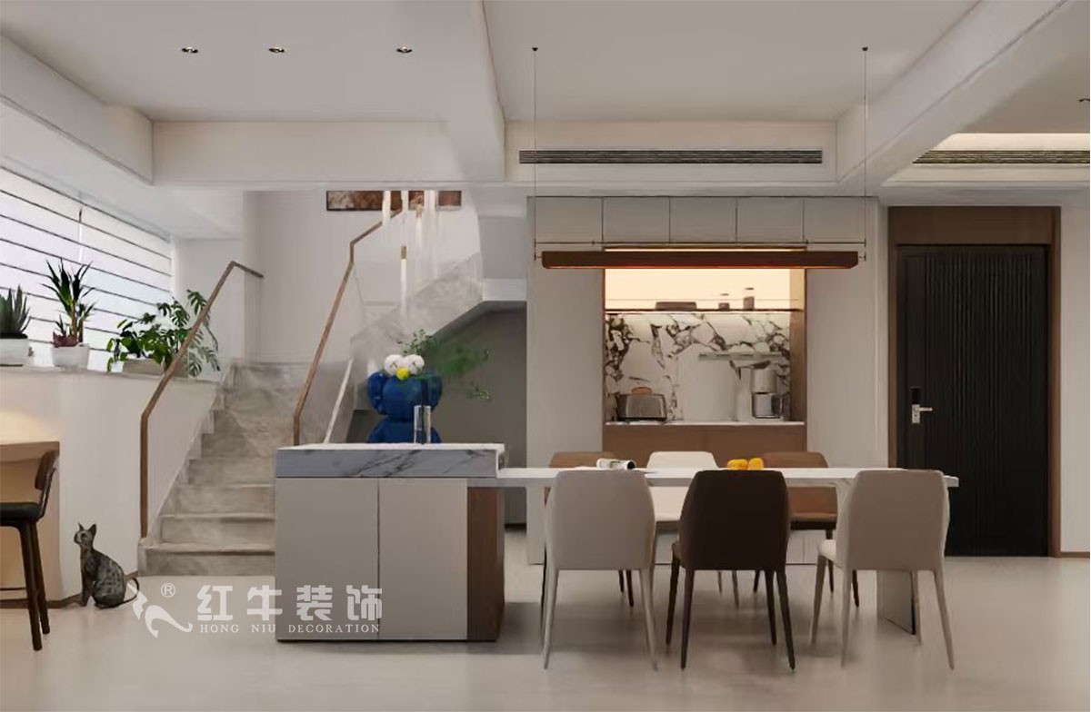 本方案一樓樓梯區(qū)域優(yōu)化改造,重新規(guī)劃樓梯位置,有效擴容廚房操作與餐廳活動面積,讓進門視野豁然開朗,整體格局更顯通透舒展,契合空間高效利用的設計需求。