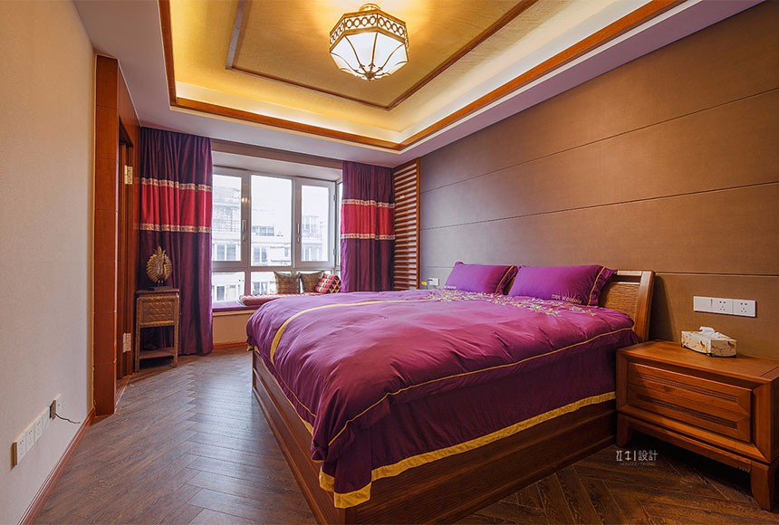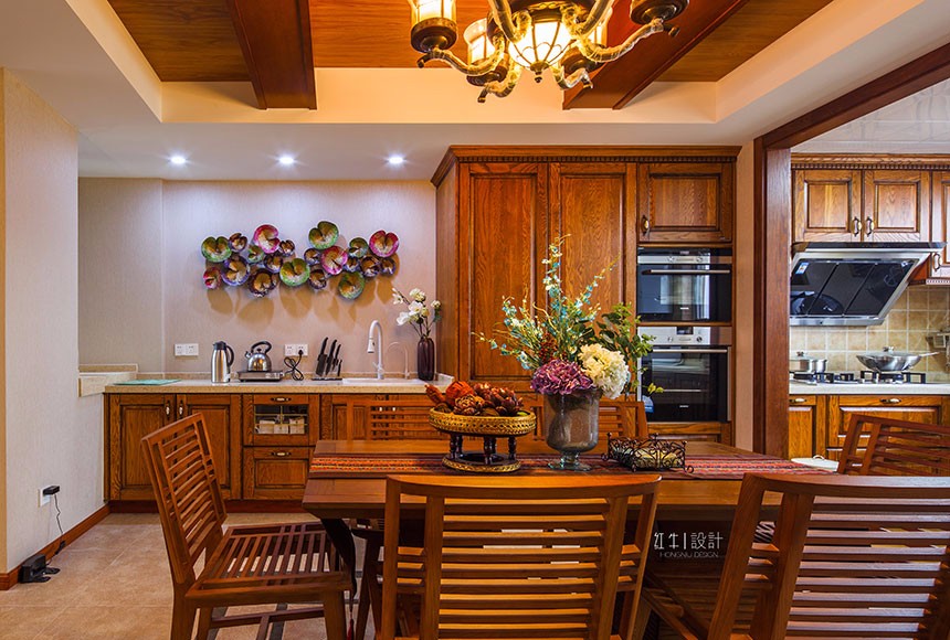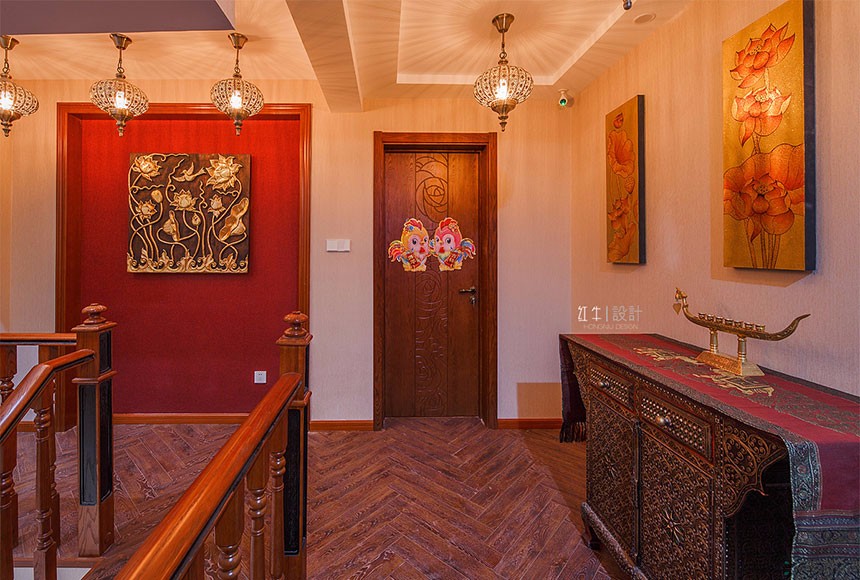 整個(gè)空間不難發(fā)現(xiàn)墻面上采用了很多的實(shí)木作為裝飾,電視背景墻兩個(gè)的實(shí)木雕花隔斷,配合象征吉祥的荷花圖案的壁紙,頂面的不同材質(zhì)的粱柱結(jié)合,實(shí)木的家具,使得家里透著沉穩(wěn),墻面采用了米灰色系的墻紙,作為家里大面的襯景,使得家里安靜溫馨。在南面的這個(gè)墻面采用了東亞南民族的紅色,一下把整個(gè)風(fēng)格的熱情帶動(dòng)了起來(lái),用沖突的綠色窗簾,空間又提亮了很多。實(shí)木描金的雕刻,頂上的純銅的燈飾,使得家里沉穩(wěn)中透著貴氣。