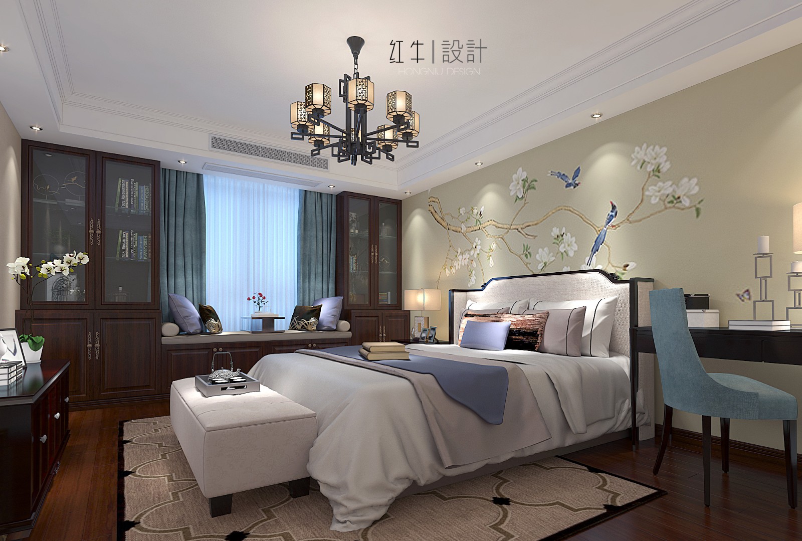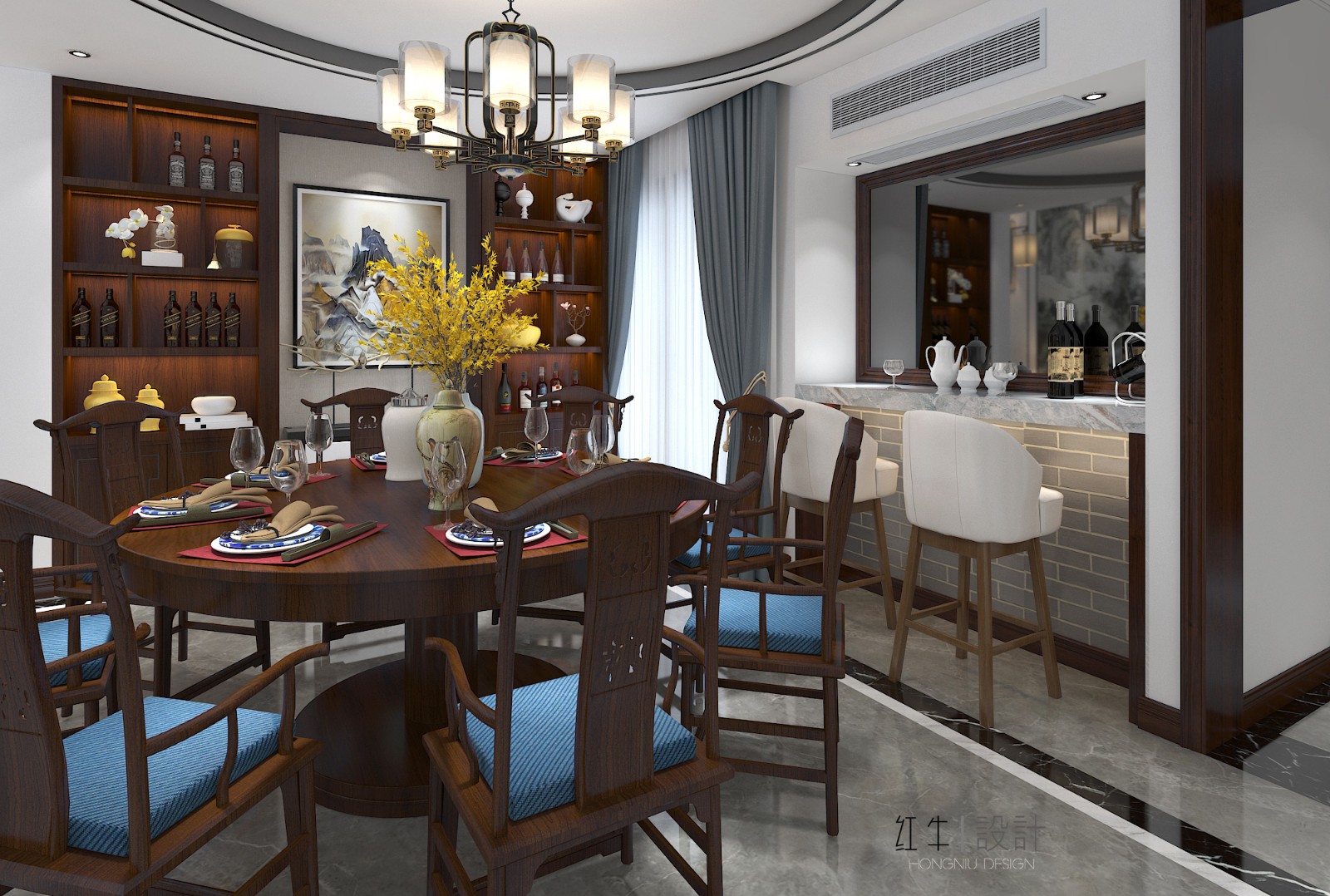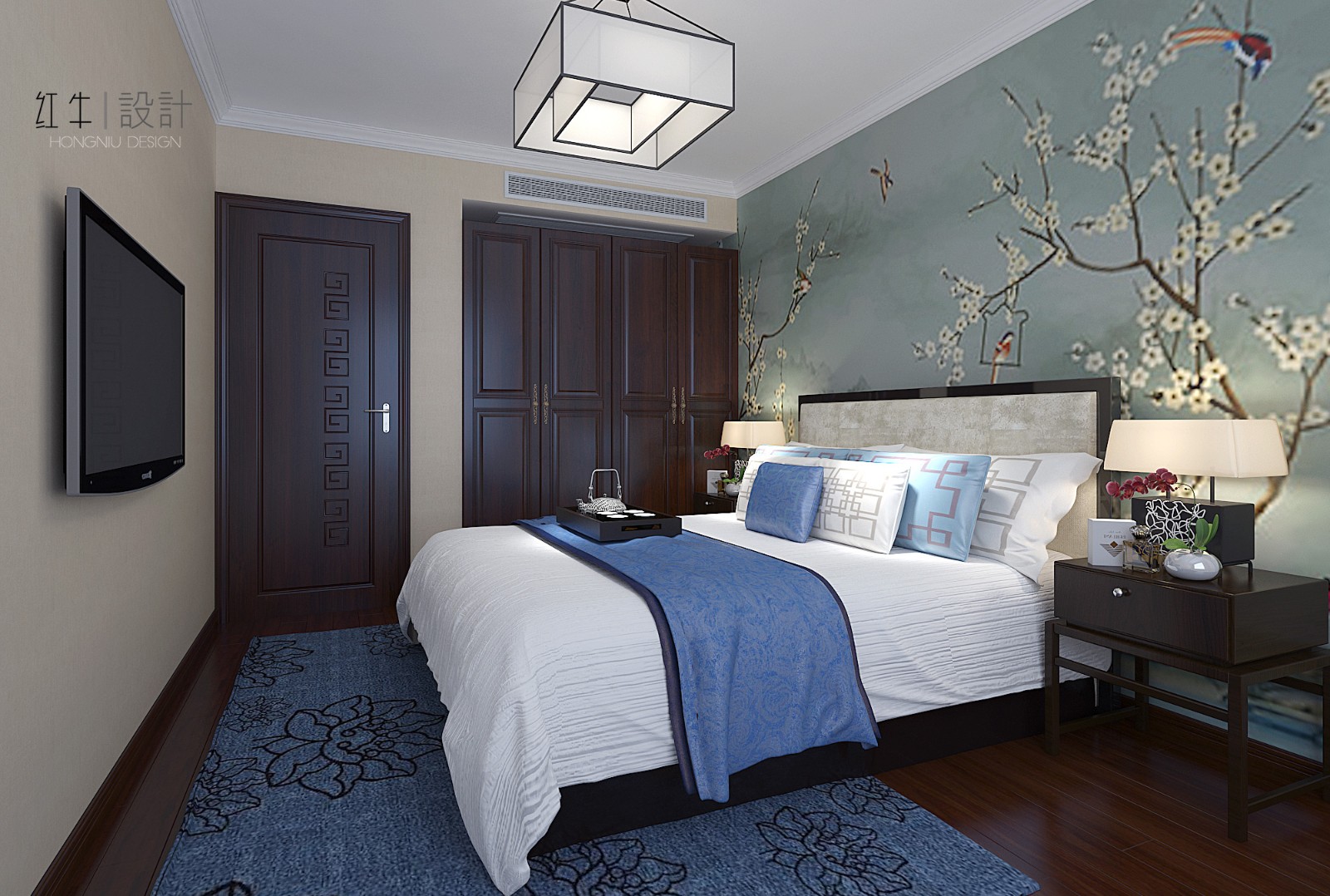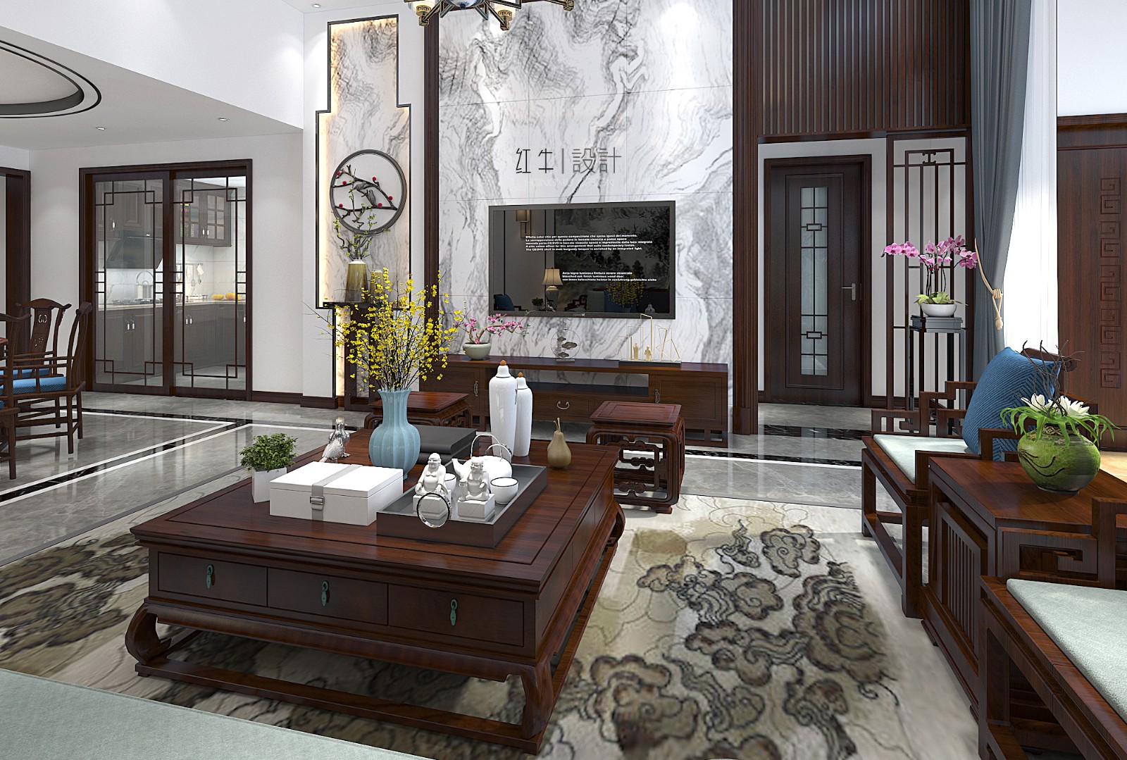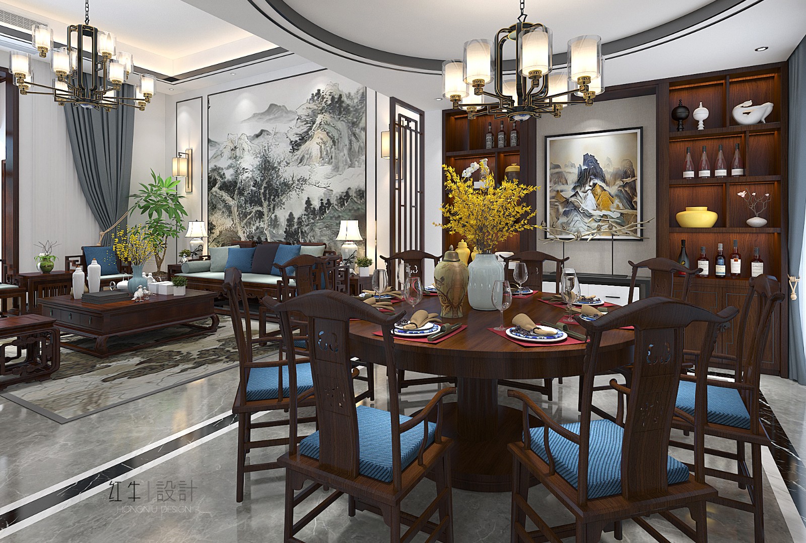 大面積的藍(lán)色賦予了整體空間莊重與優(yōu)雅,色彩濃厚而成熟,增加了空間的溫暖感與穩(wěn)重感,體現(xiàn)中式文化深沉、厚重的底蘊(yùn)。