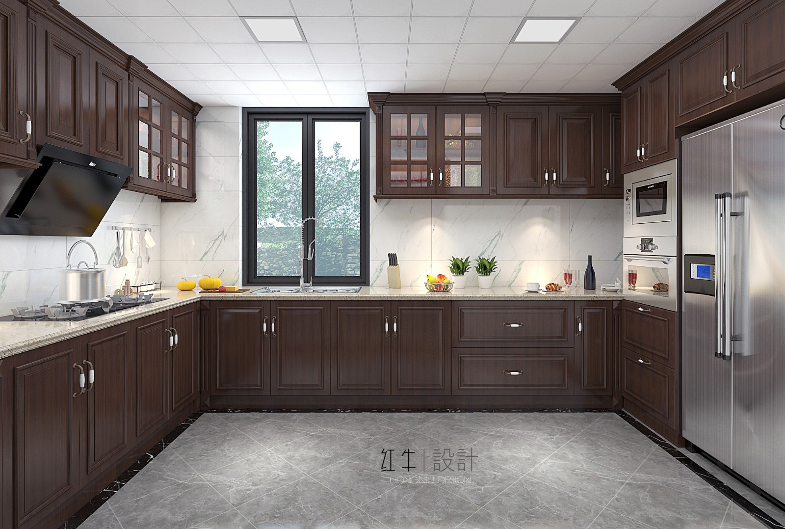 可以看出,廚房的面積很大,深沉的紅色板材將廚房營造地分外沉穩(wěn)低調(diào),地面鋪上大塊的菱形地磚,簡單卻大氣。
