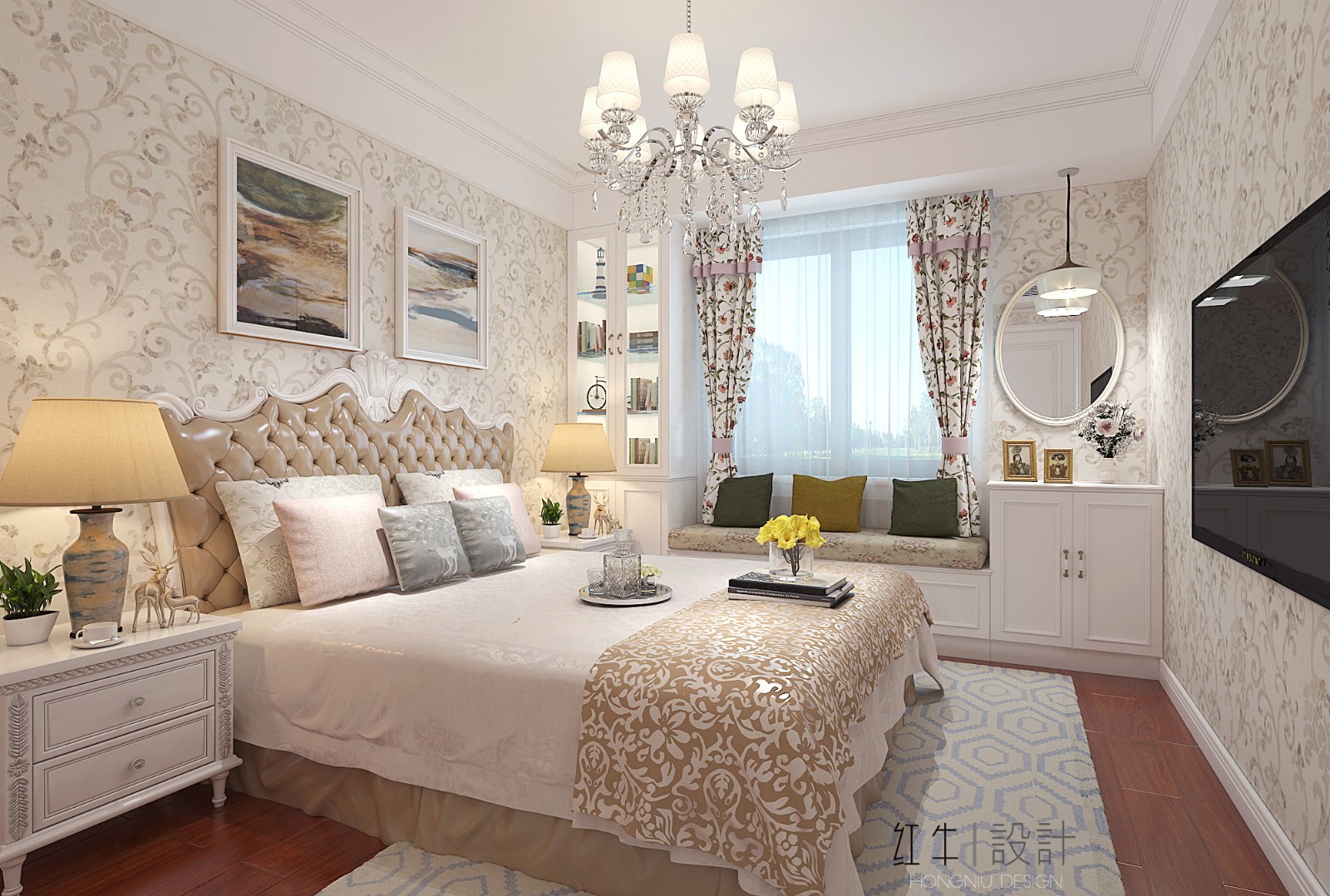 這間是女兒房,女孩一直向往飄窗和單獨(dú)的化妝區(qū)域,所以在靠窗位置設(shè)計(jì)一個(gè)裝飾飄窗和化妝一體的多功能柜。