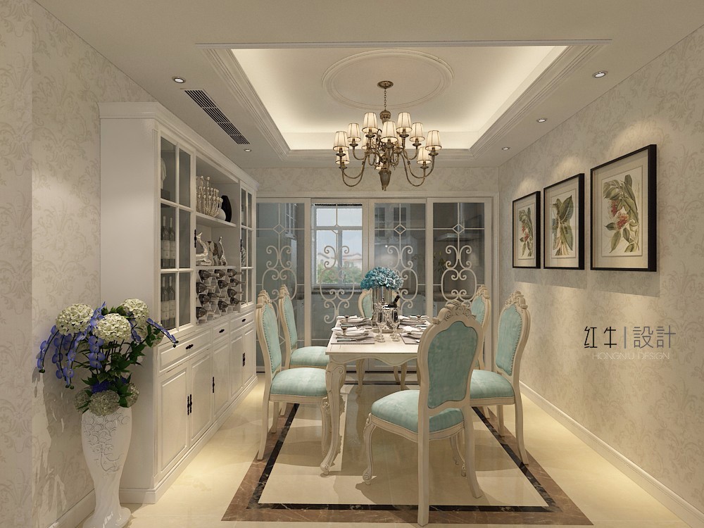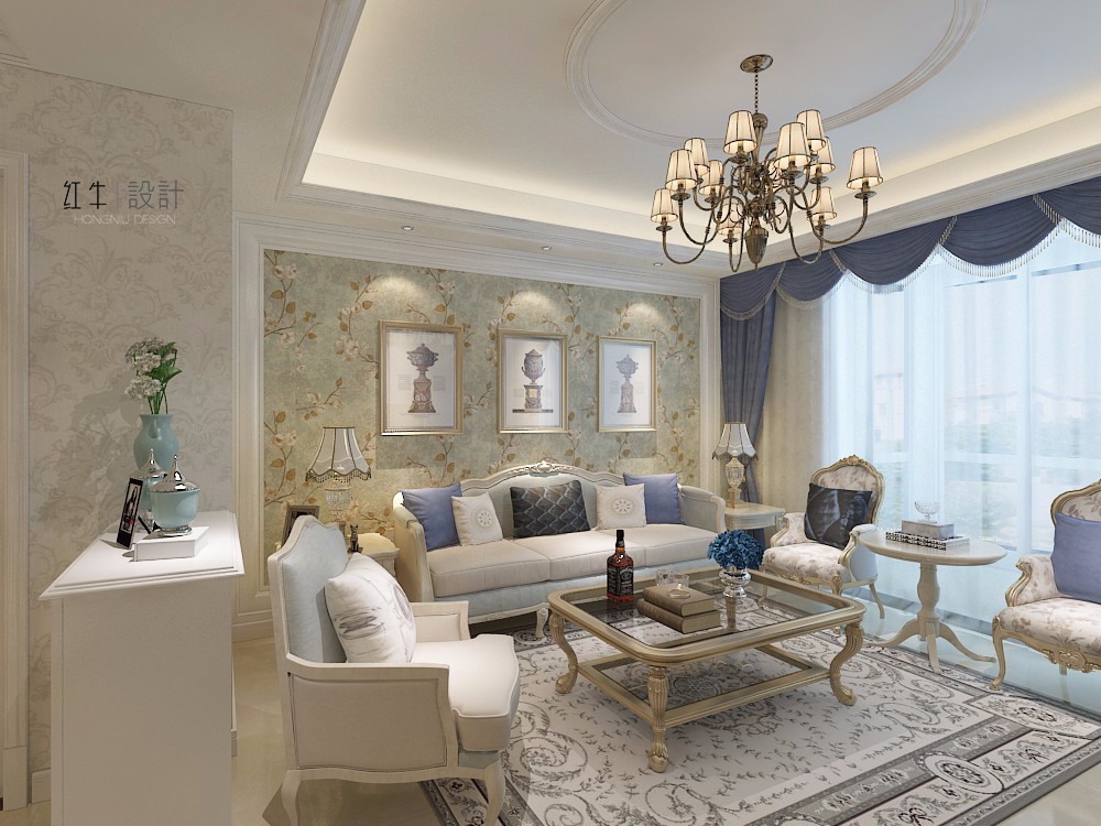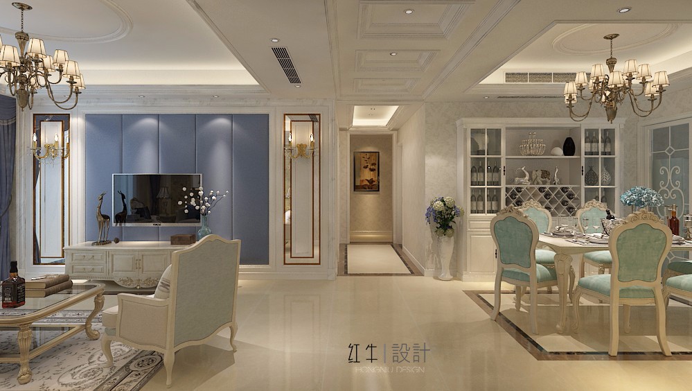 在設(shè)計(jì)的時(shí)候,居室色彩主調(diào)以白色,家具為古典彎腿式,部分家具和門為白色,采用嵌入式石膏吊頂和線條,搭配精致的水晶吊燈,營(yíng)造出浪漫的感。以磚面作為地面裝飾材料,有很好的光澤感,在沙發(fā)區(qū)鋪上大幅花紋地毯,使空間區(qū)域劃分更加清晰。
