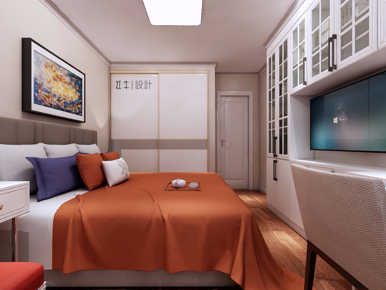 通過結(jié)構(gòu)改動(dòng),門洞方向的改變將原本不規(guī)整的客餐廳空間變得規(guī)整,讓生活動(dòng)線更加自然,閑適。大面積的儲(chǔ)物柜設(shè)計(jì),滿足業(yè)主儲(chǔ)藏書籍,衣物,同時(shí)嵌入式的辦公桌,讓空間不顯得擁擠。