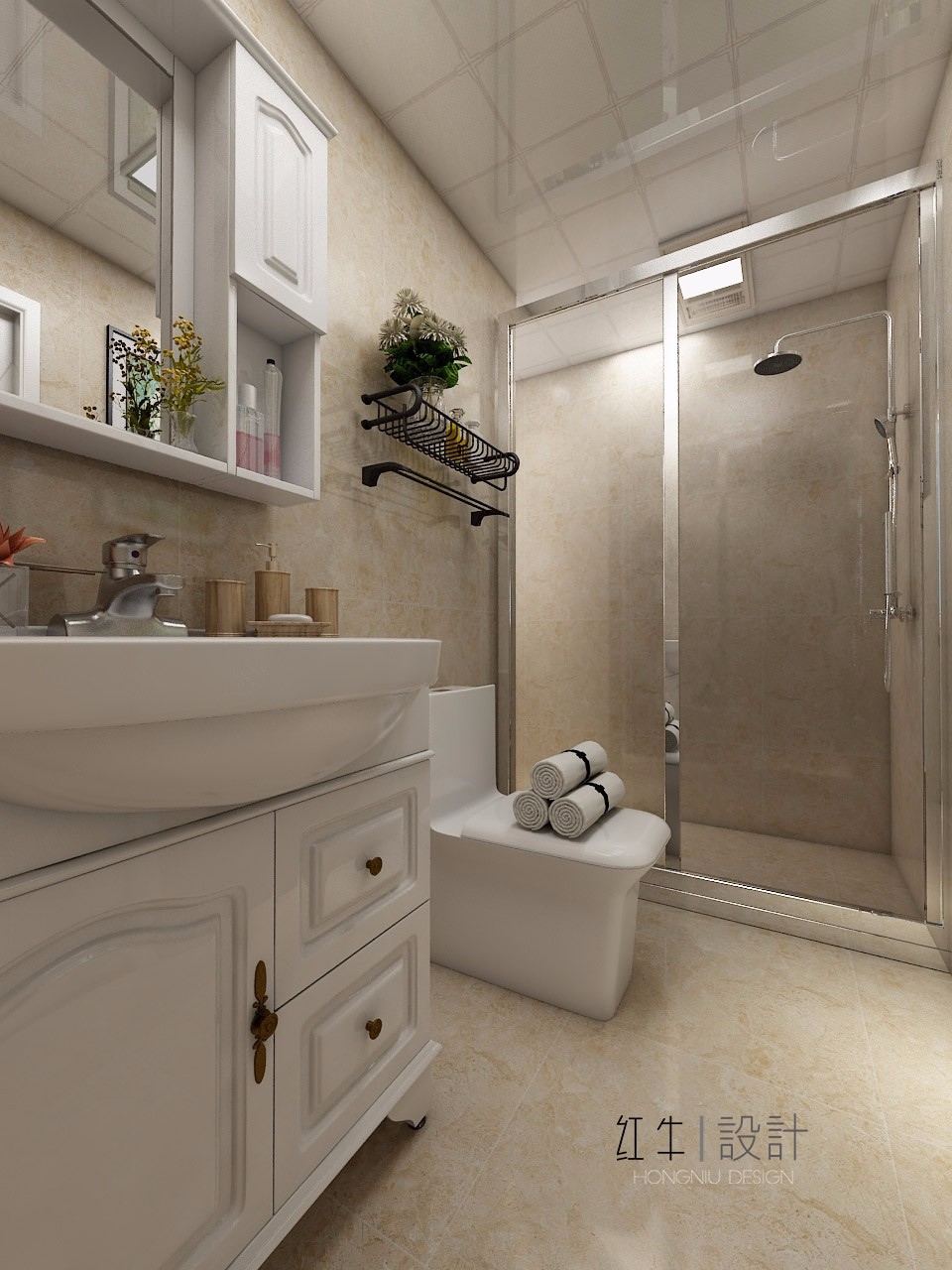 衛(wèi)生間里面不但有洗手臺、底柜,還安裝了鏡柜,開放式柜子與封閉式柜子組合在一起的設計,讓物品收納有針對性、更細致。化妝鏡下方的置物板平時可以放置常用物品,方便又貼心。