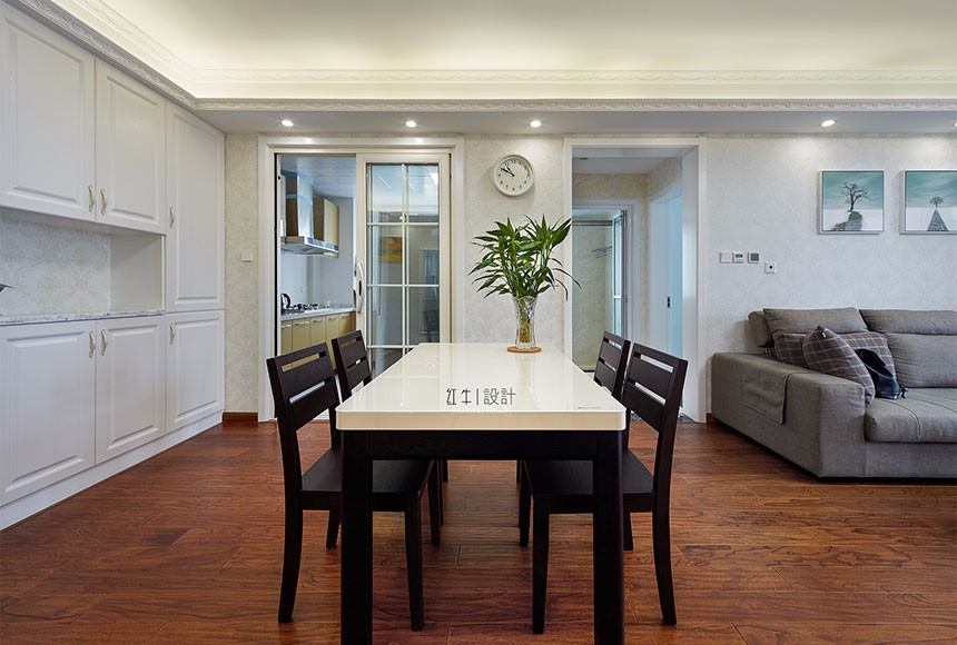 從全面考慮,客廳明亮但不刺眼的光線,使整個(gè)空間柔和,干凈,像塊安靜美麗的湖泊。餐廳木頭樸素溫潤的質(zhì)地總是讓人感覺到微暖,身邊有了木頭,就有了身在大自然的親切舒適感。