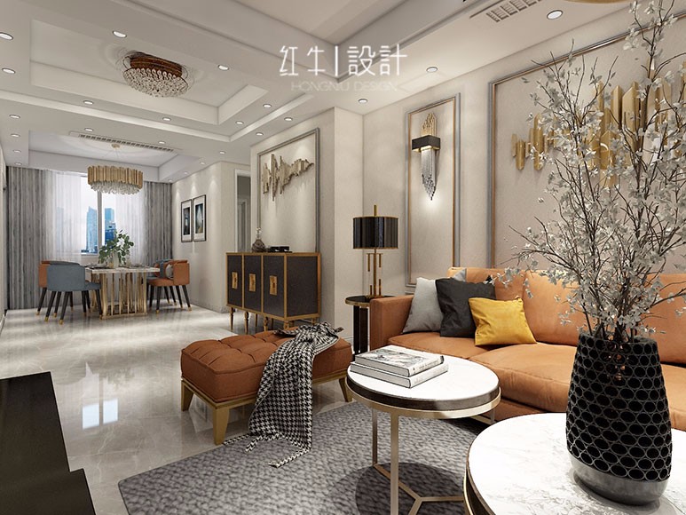 本案以陳設(shè)藝術(shù)品及金屬線條材質(zhì)來營造大氣、自然、輕奢的鉆石美學(xué)氛圍。墻面、地面、家具陳設(shè)等均以簡潔的造型、精細(xì)的工藝為其特征,強(qiáng)調(diào)品質(zhì)感和細(xì)節(jié)處理。在色彩搭配主要以暖色為主,溫馨的客桌花束、明亮的家具、直觀大氣的金屬材質(zhì),帶著淡淡的隨意,隨著輕輕的希翼讓人感受到的是空間彌漫的溫馨與舒暢。