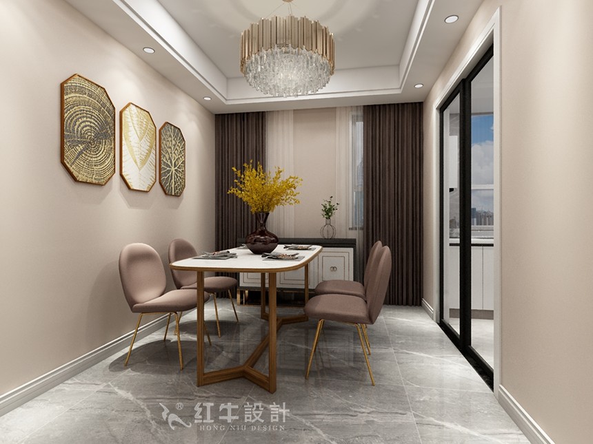 餐廳延續(xù)了客廳的設(shè)計風(fēng)格,玲瓏質(zhì)感的吊燈散發(fā)出柔和的光芒,配合墻面的藝術(shù)掛畫,提高了用餐區(qū)的格調(diào)。