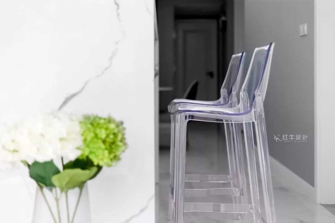 幽靈椅因其獨特的透明材質(zhì)弱化了實際尺寸感,作為吧臺椅的存在,與現(xiàn)代簡約風格是天生一對。