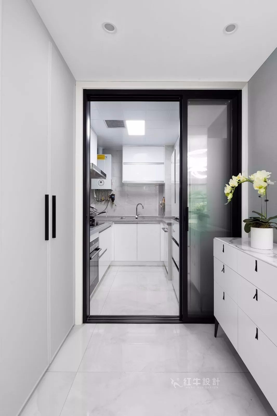 餐廳到廚房之間的過道沒有浪費,一面設計了頂天立地的收納柜,一面是可以擺放裝飾品的斗柜。