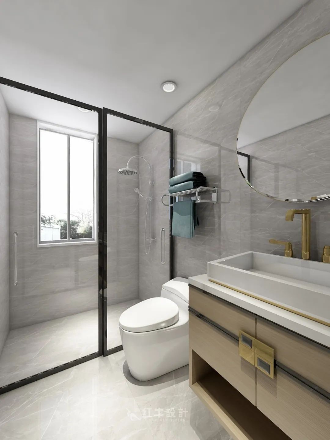 簡潔、利落的圓形鏡,打破了衛(wèi)生間的固有印象,為其添加一絲個(gè)性。顏值頗高的臺上盆,搭配黃銅龍頭,提升了空間的輕奢感。