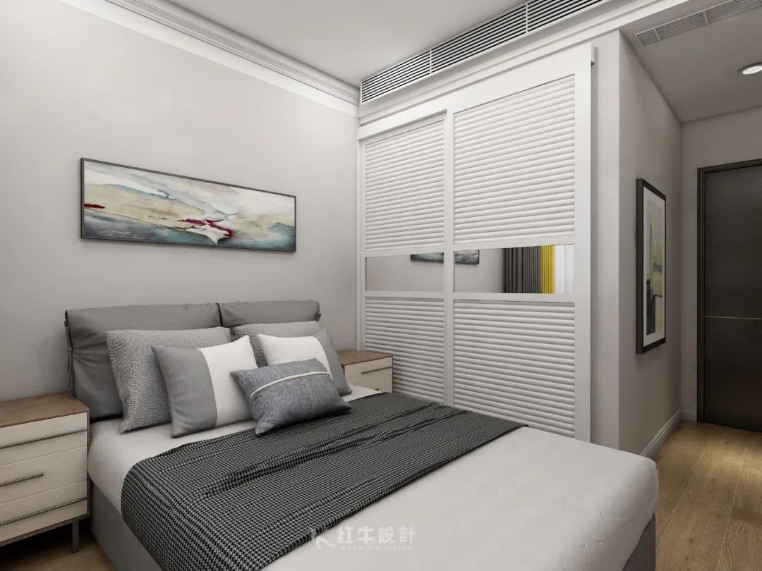 衣柜是百葉門的樣式,讓人在視覺上產(chǎn)生一種層次漸變的感覺。此外,它在通風(fēng)上也有巨大優(yōu)勢。上面的鏡子在視覺上能夠起到擴(kuò)大空間的效果。