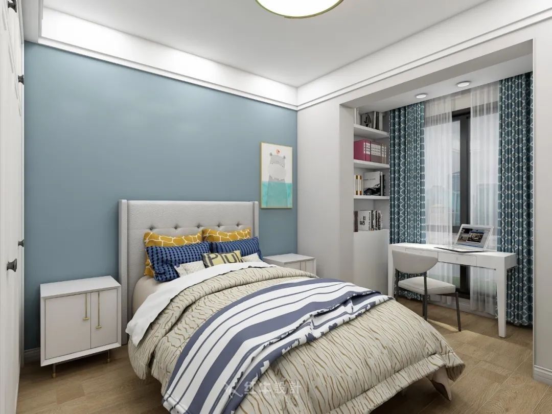 藍(lán)色的墻面營造出寧靜的氛圍。床品、裝飾畫的選擇顯得活潑有童趣。既有書桌椅,又有定制書柜,提供非常充足的學(xué)習(xí)空間。