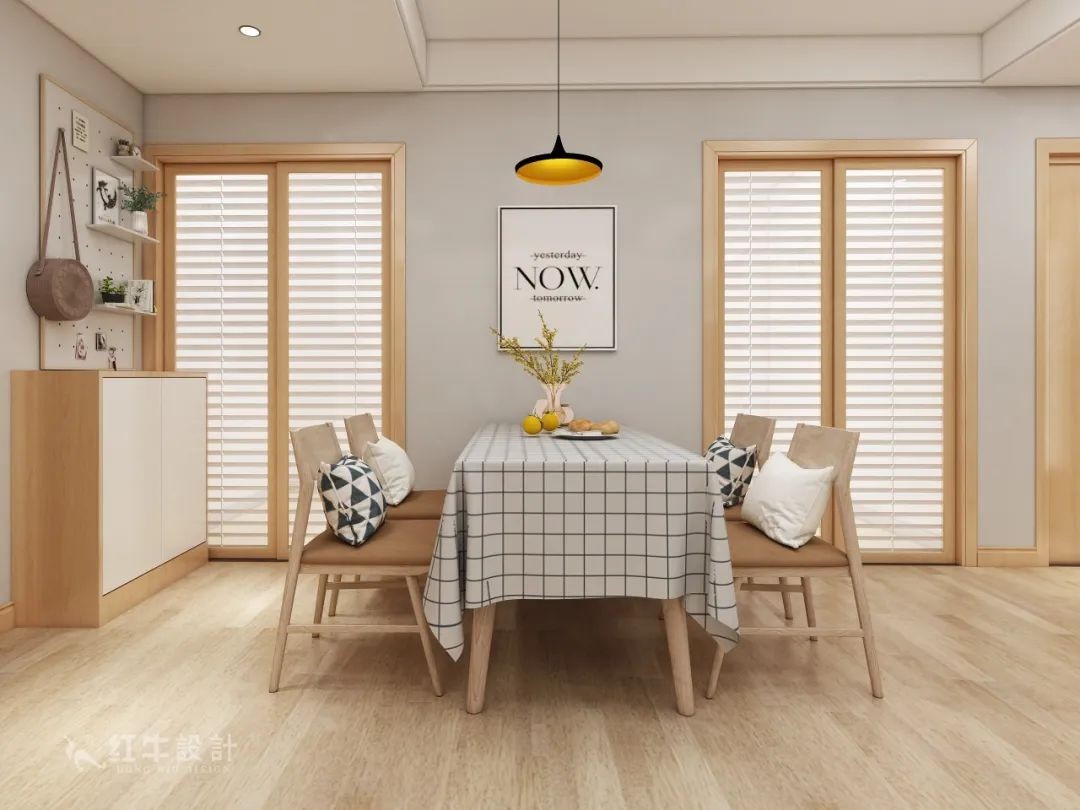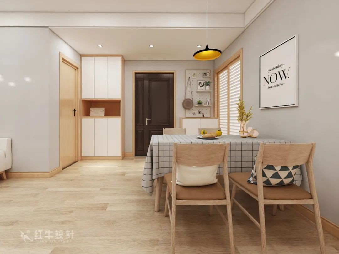 本案為北歐風(fēng)格,采用了木紋色和木色相結(jié)合的手法,加上綠植的襯托,讓整個(gè)空間看起來清新靚麗。