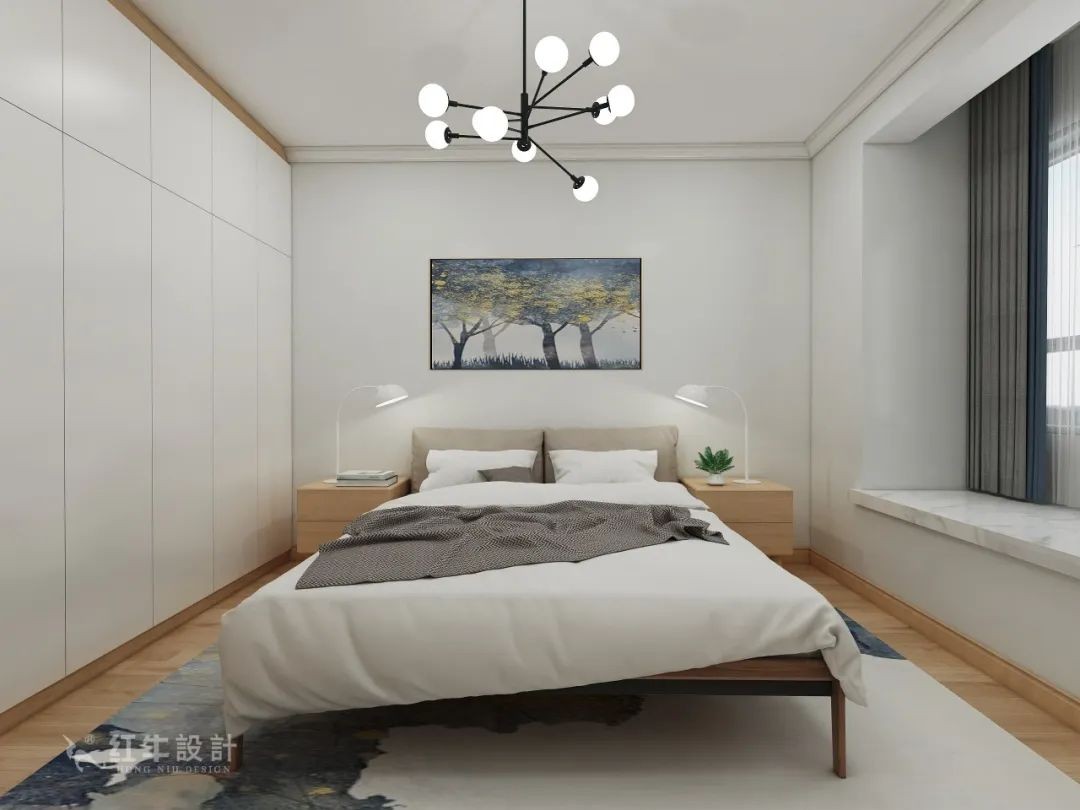 臥室的大面積白色讓空間更顯干凈明朗,搭配北歐風(fēng)家具及燈飾,清新怡人。裝飾畫讓墻面不再單調(diào),還能體現(xiàn)北歐風(fēng)接近自然的特點(diǎn)。