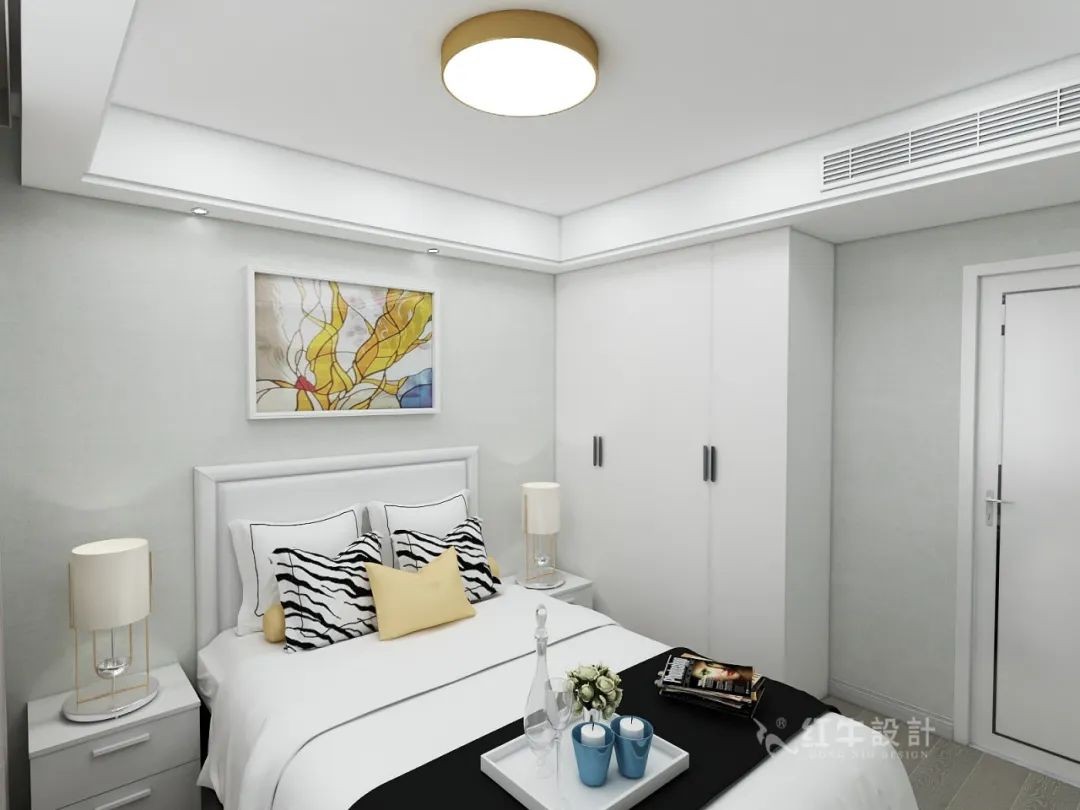 次臥室朝北,采光上沒有南邊臥室好,實用采用灰白色的墻布與純白色的床體,使得視覺上顯得更加輕盈。再通過明亮的掛畫以及金色吸頂燈,讓空間不顯單調(diào)。
