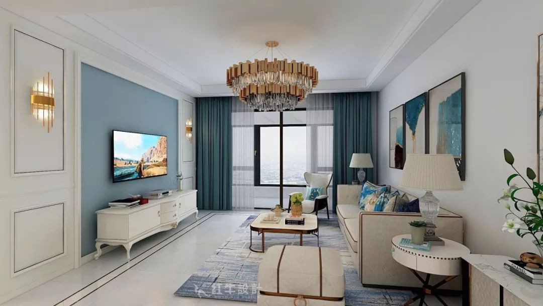 客廳以白色與藍(lán)色為基礎(chǔ)色調(diào),整體風(fēng)格干凈明快。
