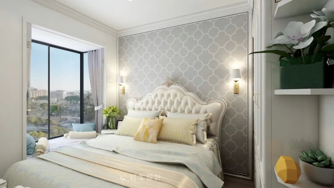 主臥考慮到是給長輩居住,在色調(diào)跟款式上略顯穩(wěn)重,灰色格紋的墻紙跟歐式的床形成鮮明的對比。