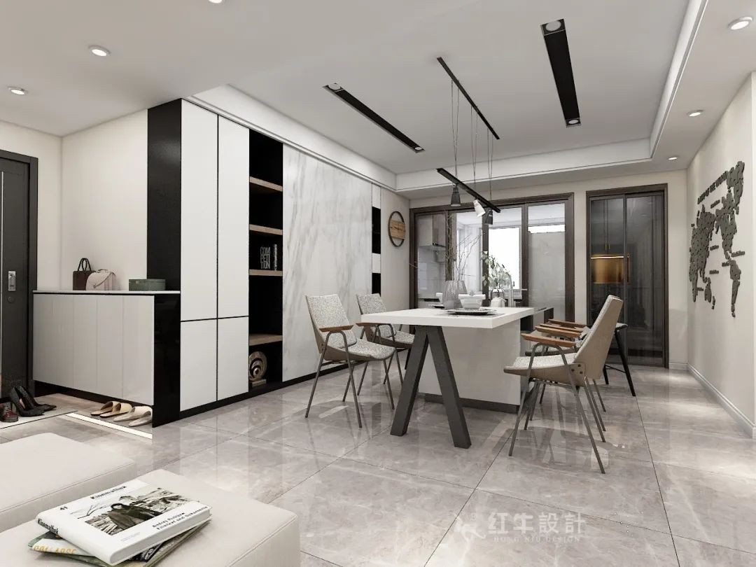 入口的門廳處設(shè)計(jì)了薄款半截懸空式鞋柜,懸空處可以放置日常的拖鞋。鞋柜柜體延伸至餐廳裝修柜,強(qiáng)化了空間的統(tǒng)一性和整體性。