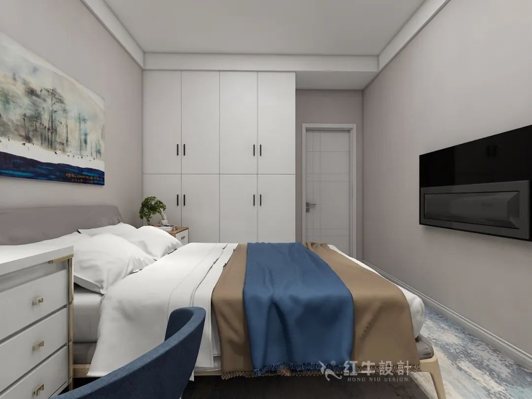北面房間面積較小,采光通風(fēng)也不理想,還與客衛(wèi)相通,顯然不可取,為了使其具備臥室的空間面積,可以把北陽臺(tái)并入,整體設(shè)計(jì)成一間能夠滿足業(yè)主需求的、功能齊全的臥室來。