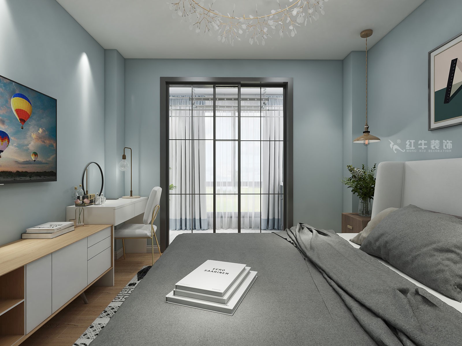 本案定義為北歐風(fēng)格,在簡(jiǎn)約風(fēng)格中也穿插了一些北歐的元素,墻面不再使用傳統(tǒng)的白色,使用了一些顏色中性的深灰色,和顏色相對(duì)鮮艷軟裝相互呼應(yīng),使得空間色彩有對(duì)比性,這樣的視覺(jué)反差,使得效果整體提升一個(gè)品味,空間不單調(diào)且舒適。