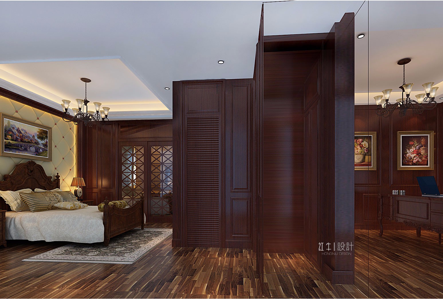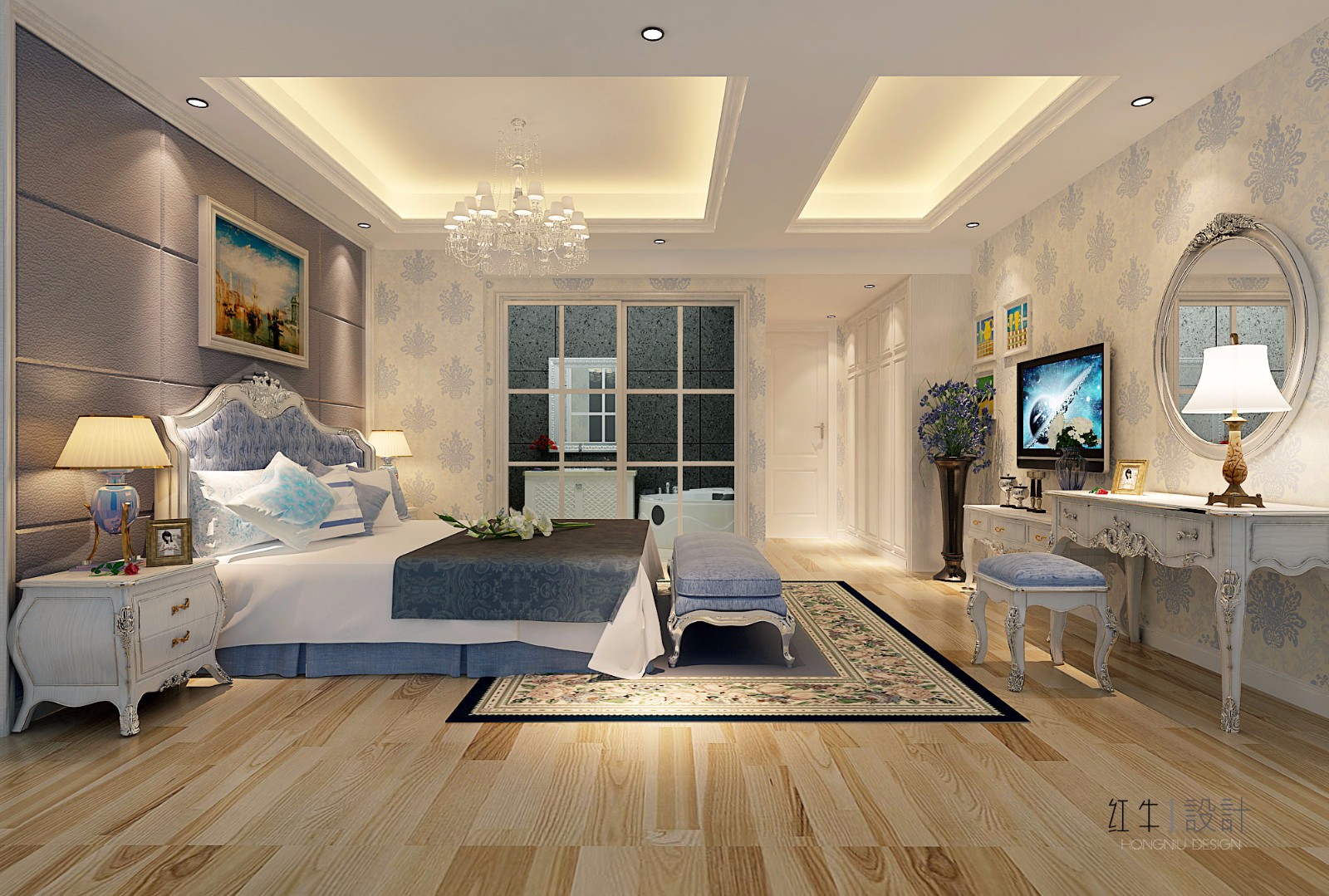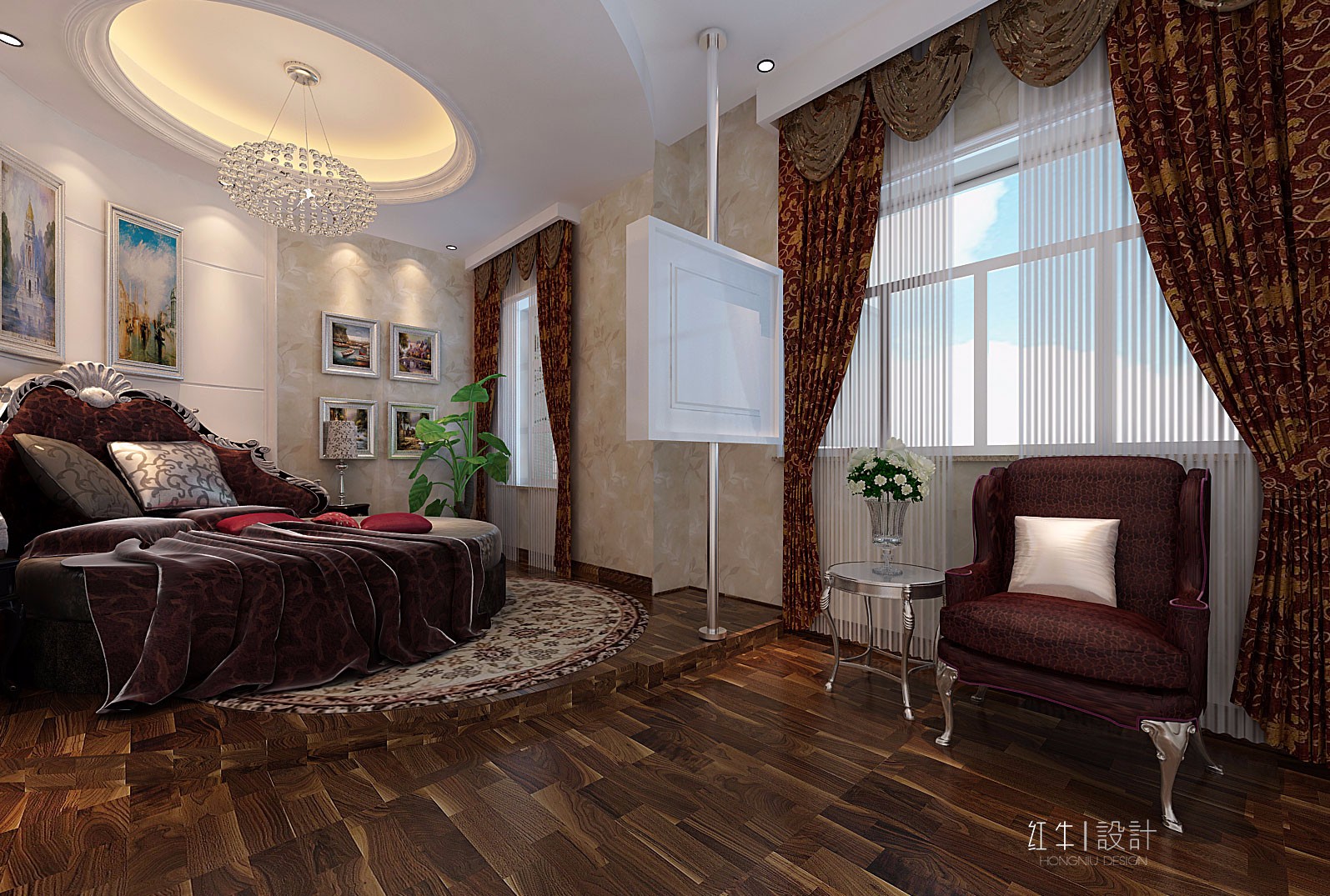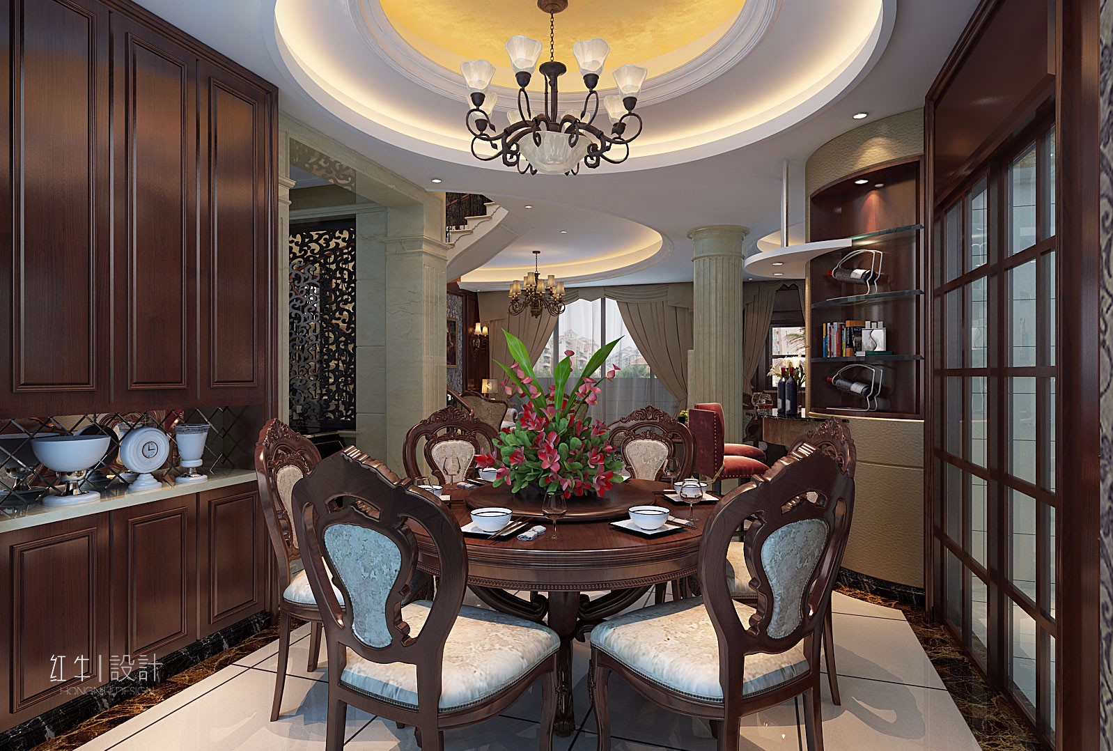 本案強(qiáng)調(diào)線形流動的變化,將室內(nèi)雕刻工藝集中在裝飾和陳設(shè)藝術(shù)上,色彩華麗且用暖色調(diào)加以協(xié)調(diào),變形的直線與曲線相互作用以及貓腳家具與裝飾工藝手段的運(yùn)用,構(gòu)成室內(nèi)華美厚重的氣氛。它在形式上以浪漫主義為基礎(chǔ),常用大理石、華麗多彩的織物、精美的地毯、多姿曲線的家具,讓室內(nèi)顯示出豪華、富麗的特點(diǎn),充滿強(qiáng)烈的動感效果。