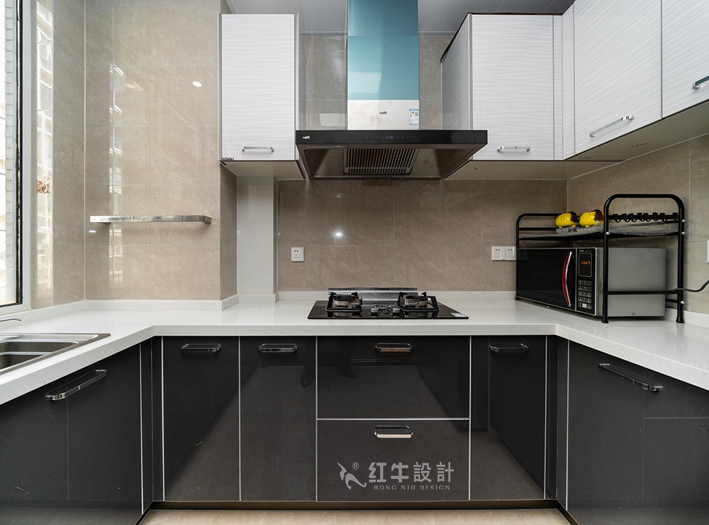 廚房頂部是白色吊柜,底部是黑色亮面櫥柜,而位于中間的墻壁顏色則介于這兩者之間,作為上下的調(diào)和與過度,這樣上輕下重的顏色設(shè)計(jì),顯得非常和諧。