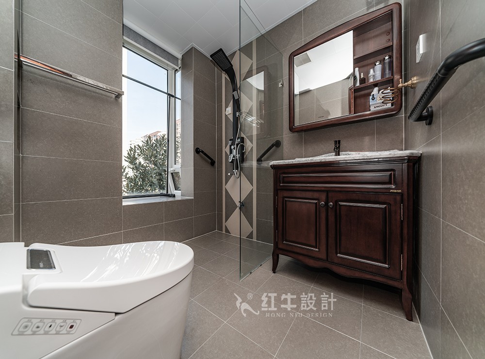 主臥的淋浴部分選擇了半隔斷設(shè)計(jì),只要遮擋住花灑,保留一平米的遮擋位置,同樣能阻擋水漬外濺,這樣的設(shè)計(jì)簡潔大方,使得衛(wèi)生間看起來更寬敞通透。