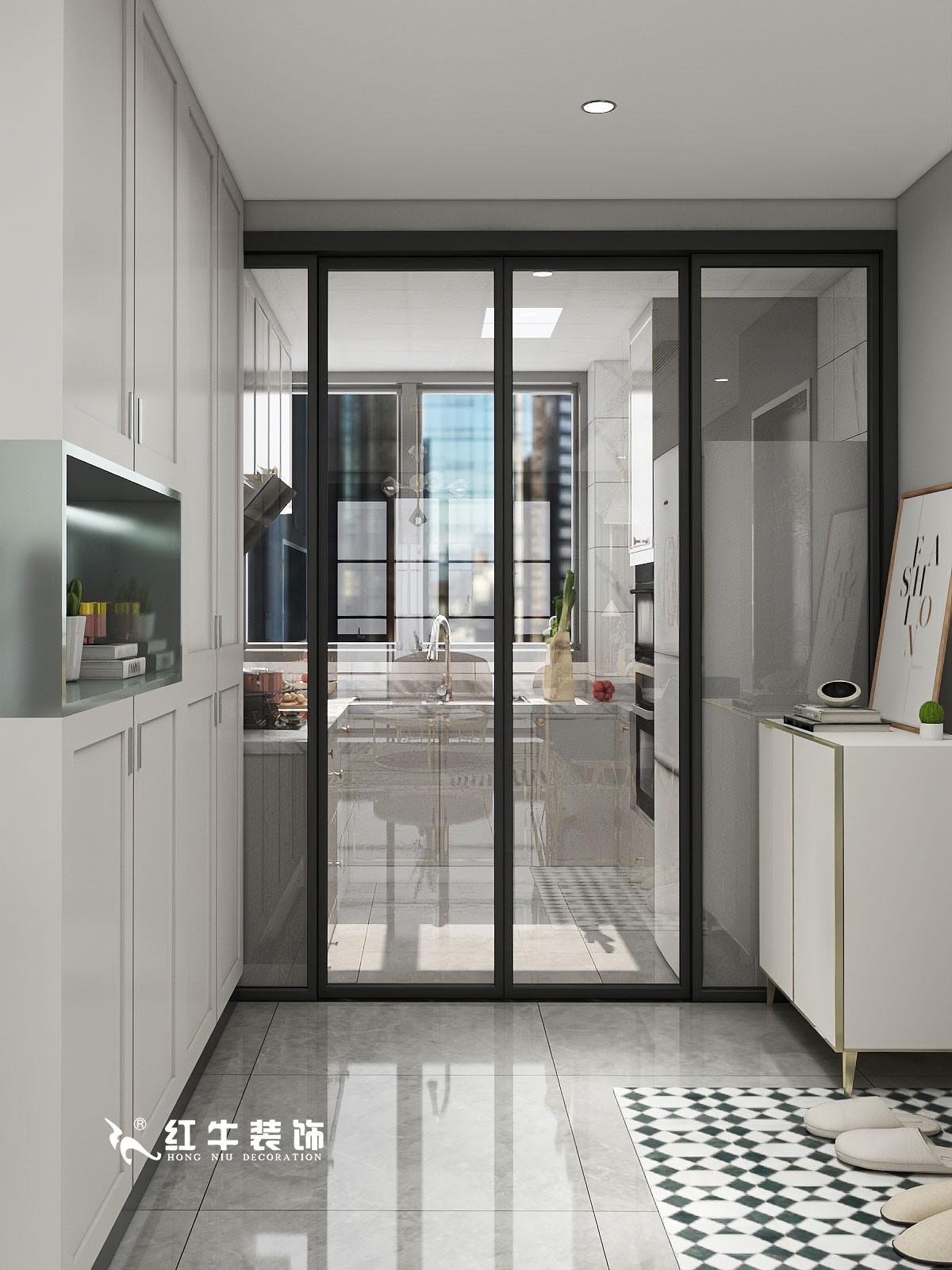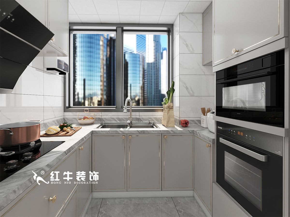 廚房選用了玻璃推門,既能保障采光,也能防止油煙外泄,還不會給人帶來的隔斷感。廚房內(nèi)部是嵌入式設(shè)計(jì),把家電嵌入到櫥柜中,家電的排列組合會更加科學(xué),整個空間看起來非常清爽。