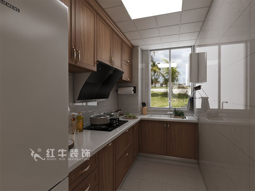 長(zhǎng)方形的廚房設(shè)計(jì)成L型,底部的櫥柜加上方的吊柜,滿(mǎn)足收納需求。窗戶(hù)下方做水槽,水槽和灶臺(tái)的中間作為操作臺(tái),洗切炒的動(dòng)線非常流暢。