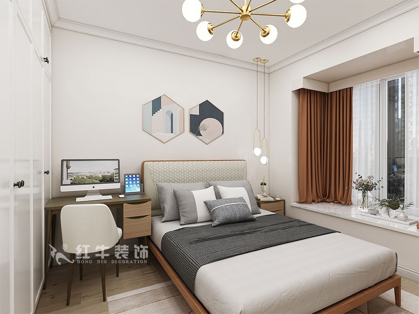 整體風(fēng)格簡約,白色和木紋色營造出溫馨的生活氣息,次臥室設(shè)計(jì)了組合柜,既有學(xué)習(xí)的區(qū)域同時也兼顧了休閑空間。
